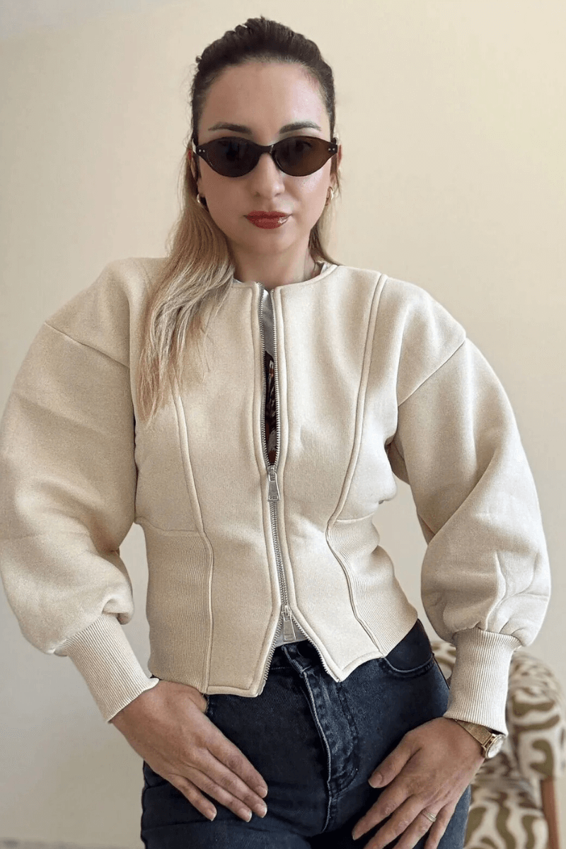 Bej Kadın Ribana Detaylı Fermuarlı Üç İplik Hırka