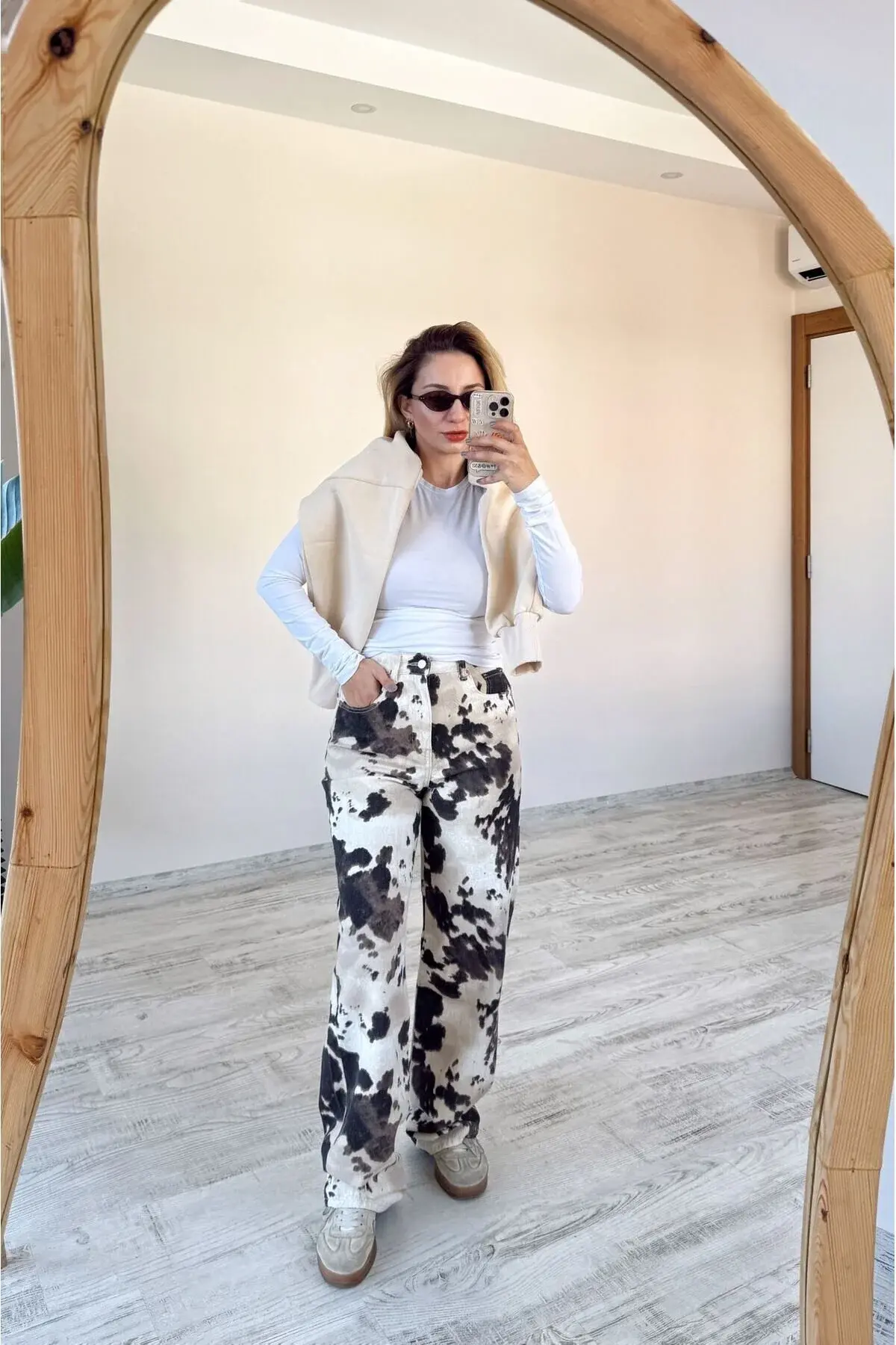 Benek Desenli Krem ve Kahverengi Yüksek Bel Jean