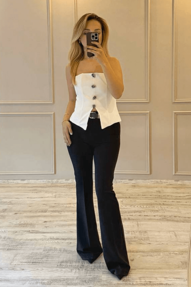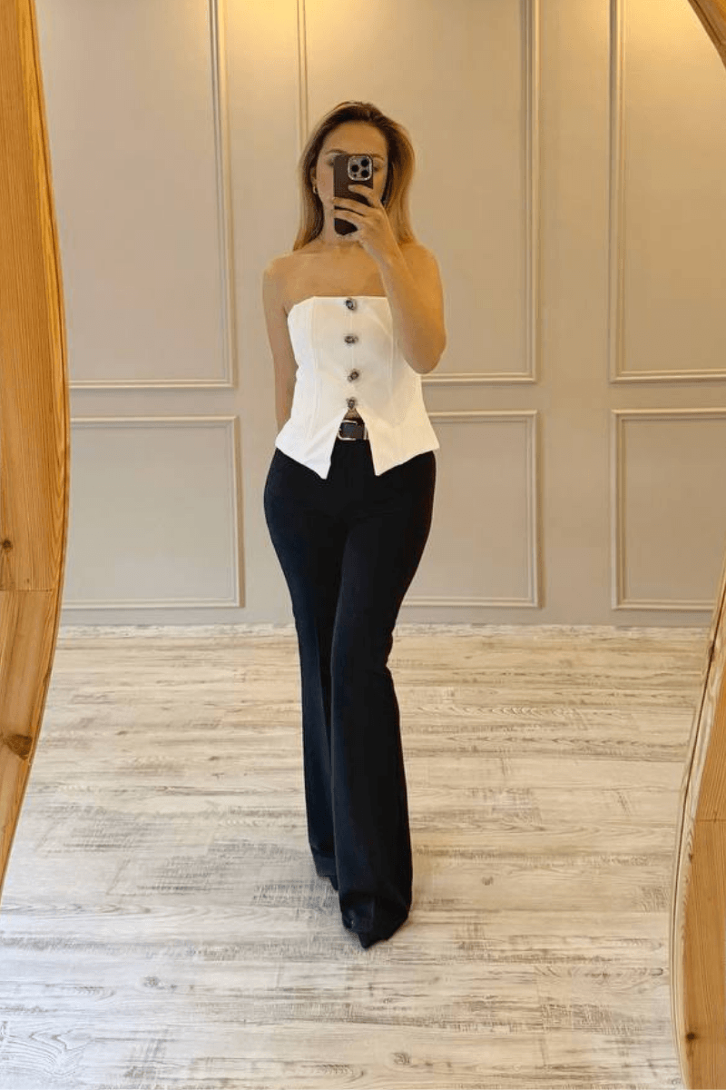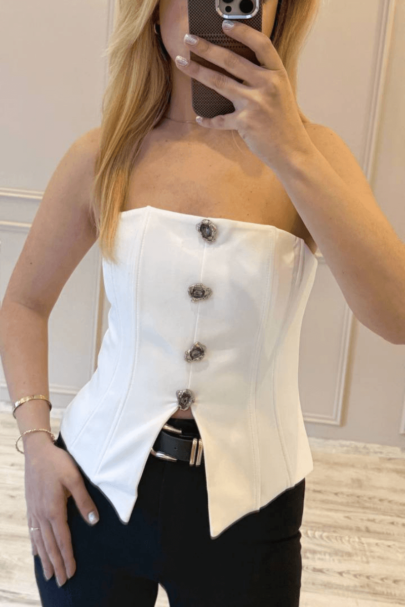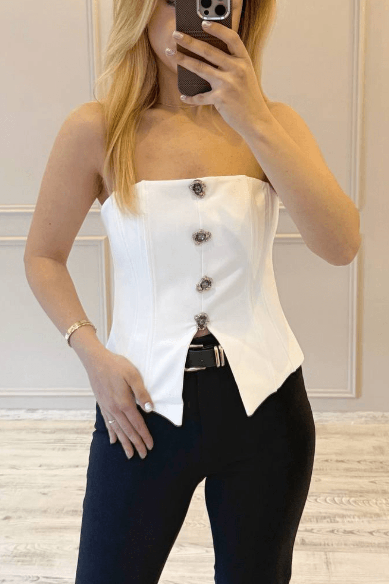 Zarif beyaz straplez büstiyer, şıklığı ve konforu bir arada sunar. Gece davetleri ve özel günler için tasarlanan premium kalite kumaşı, vücuda mükemmel oturur. Arkadan fermuarlı yapısıyla kolay kullanım sağlar ve her kombine sofistike bir dokunuş katarken, kullanışlılığıyla da öne çıkar.Bu beyaz büstiyer ile girdiğiniz mekanın en şık kadını olacaksınız.