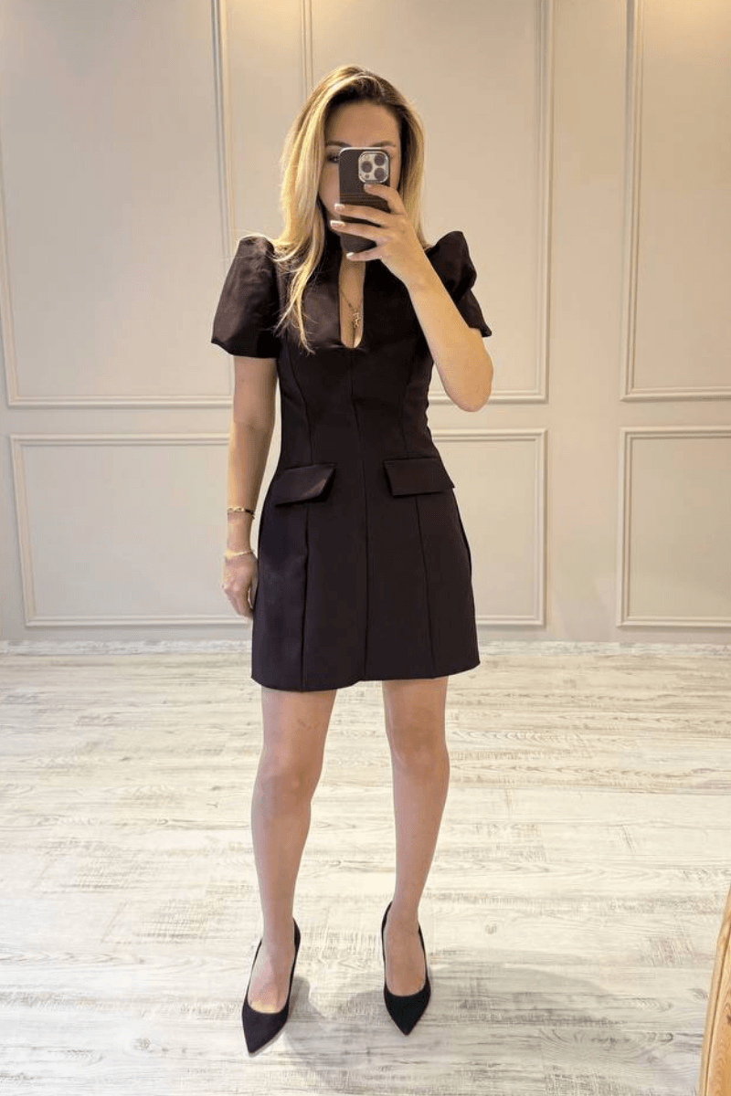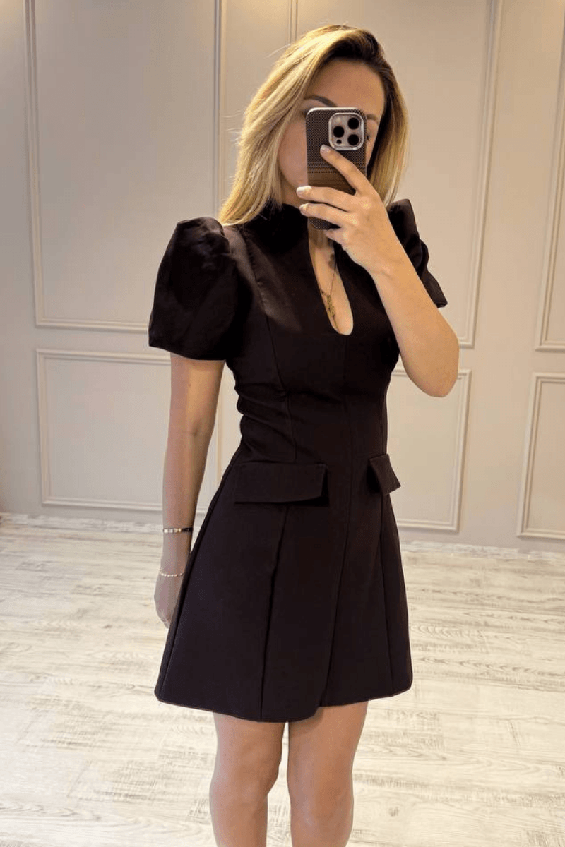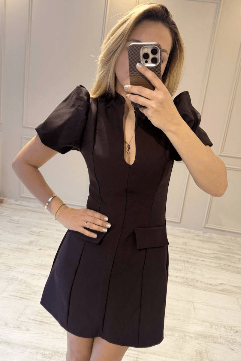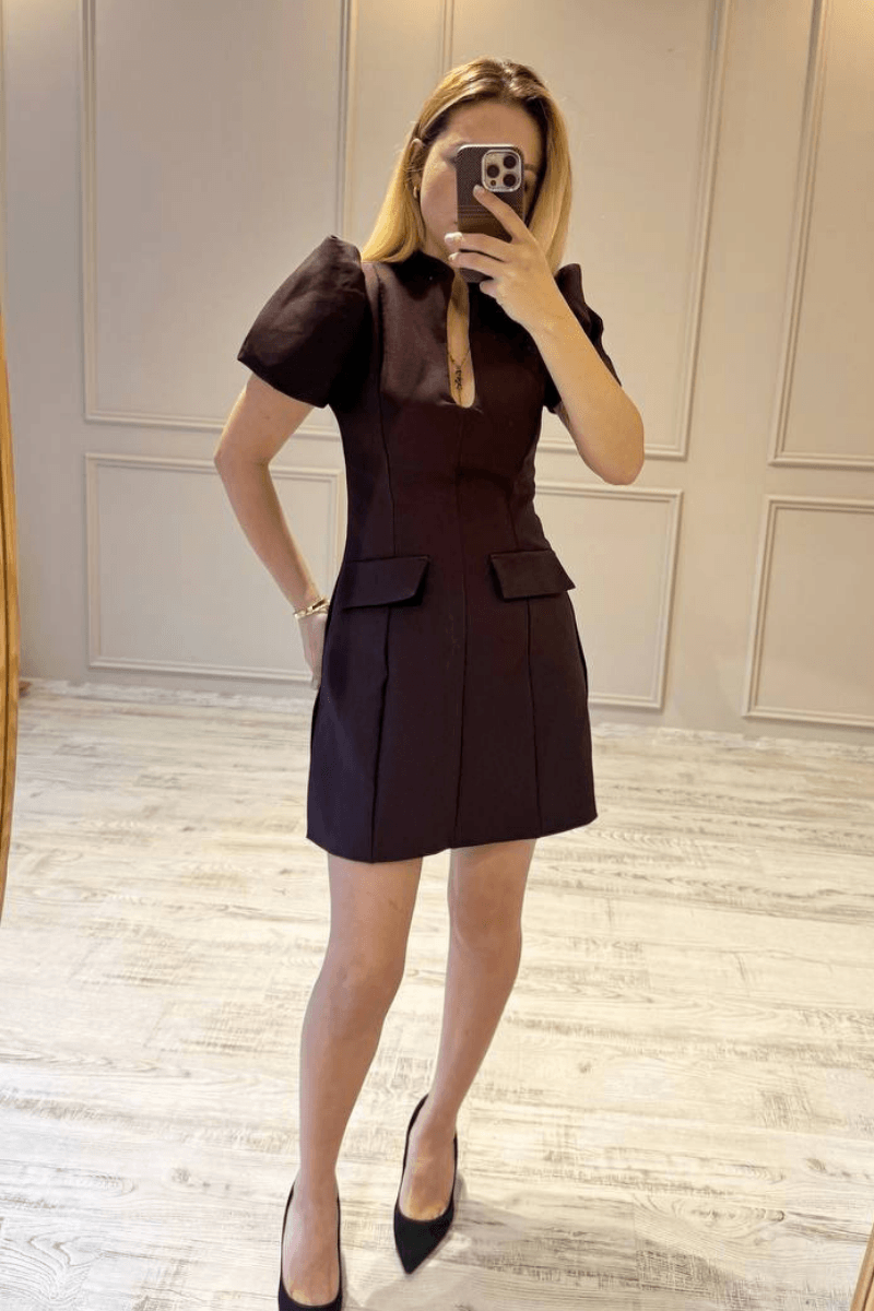 Damla Yaka Balon Kol Mini Elbise/ Mürdüm