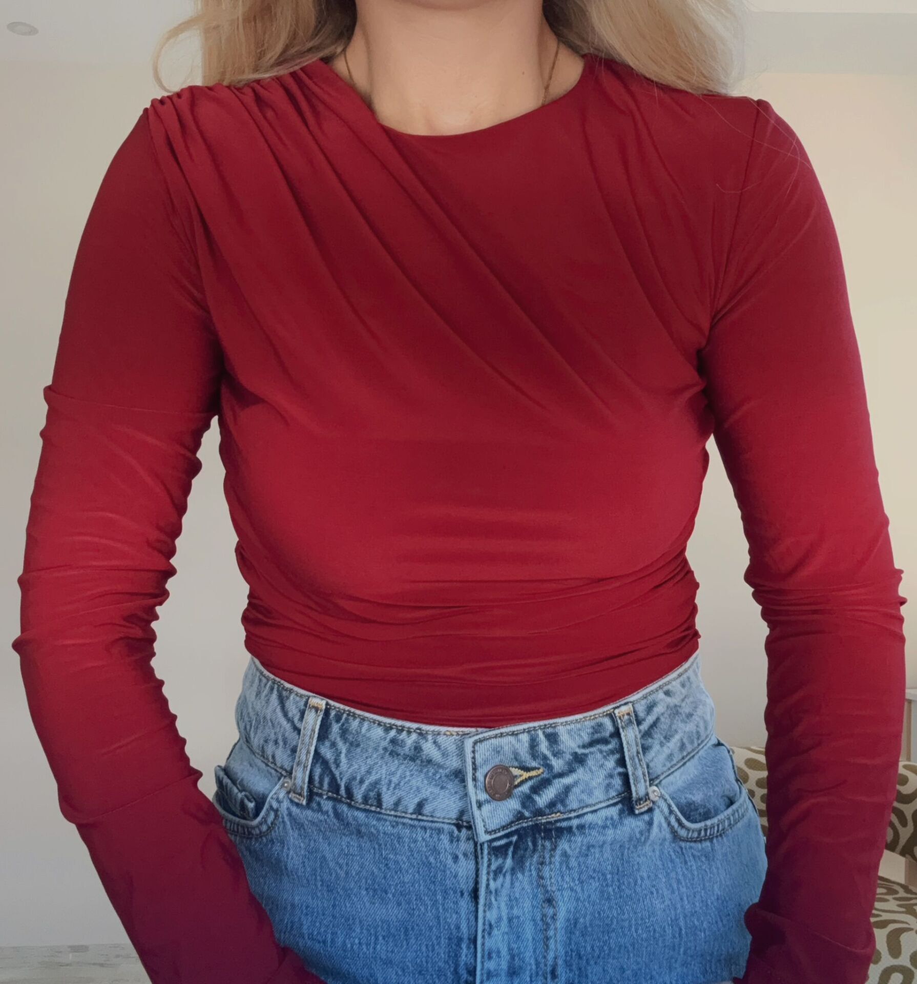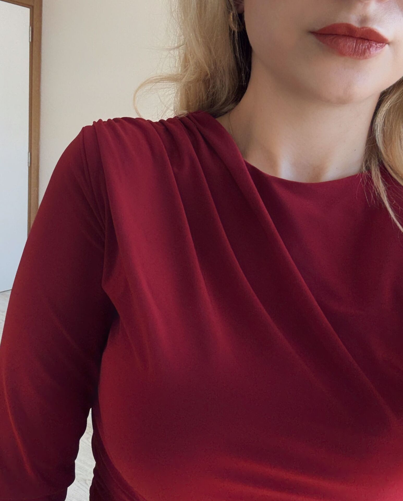 Bordo Tek Omuzda Büzgü Detaylı Body Suıt