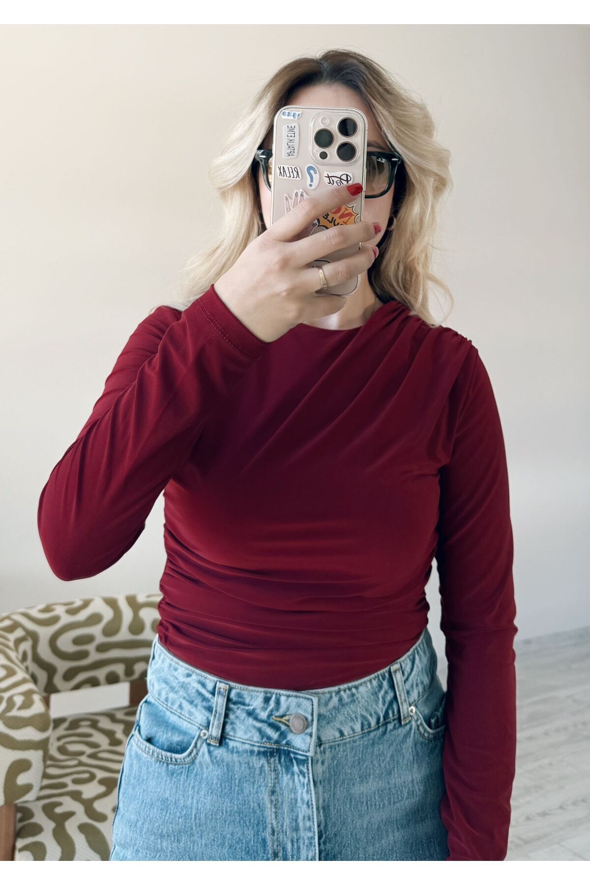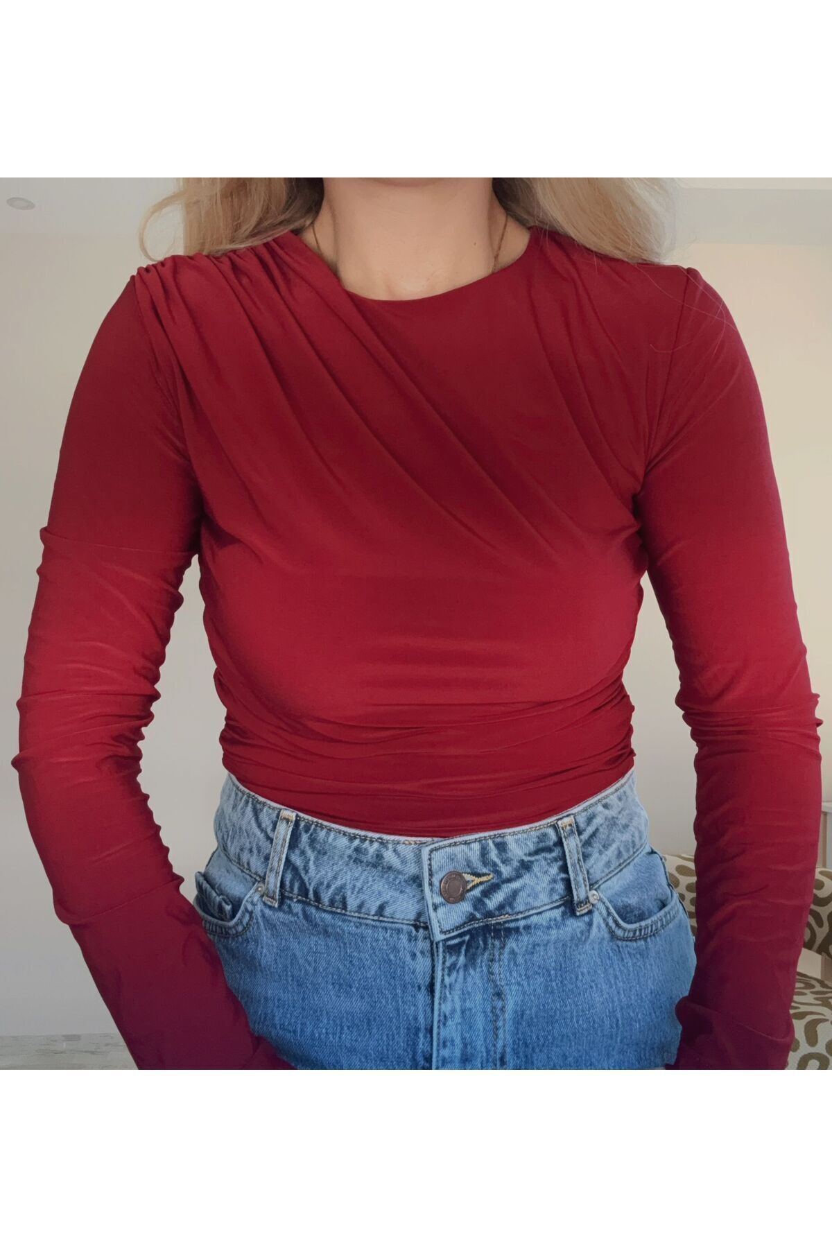 Bordo Tek Omuzda Büzgü Detaylı Body Suıt