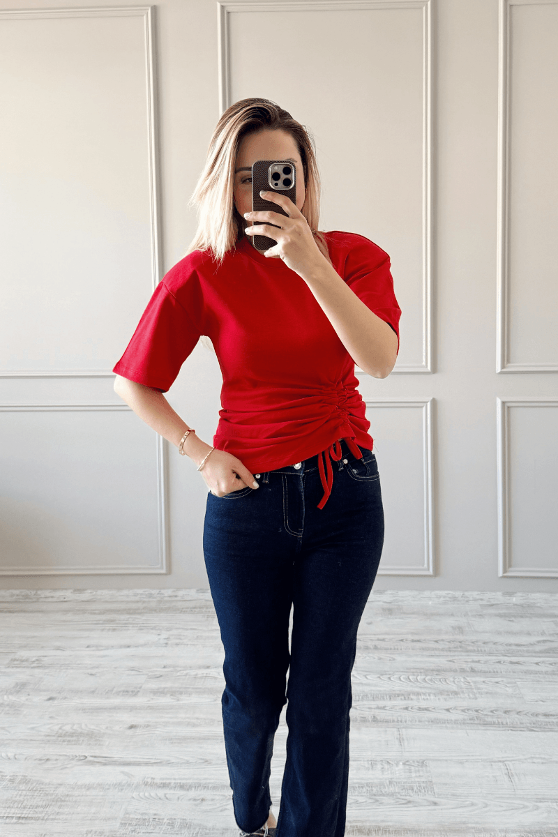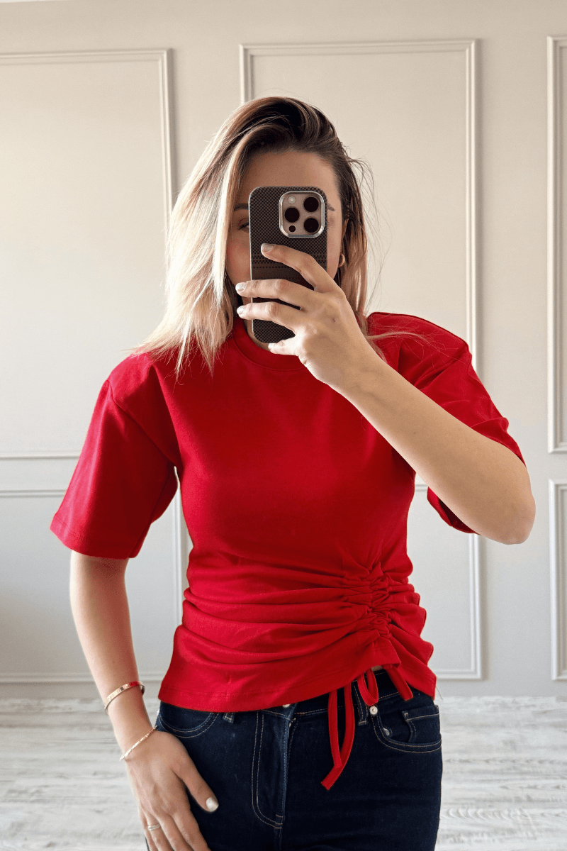 Kırmızı renkte, omzu vatkalı ve büzgülü detaylara sahip bu t-shirt, şık ve rahat bir görünüm sunar. Basic kesimi sayesinde kolay kombinlenir ve her tarza uyum sağlar. Hem günlük kullanıma hem de özel anlara uygun, kullanışlı bir tasarımdır.