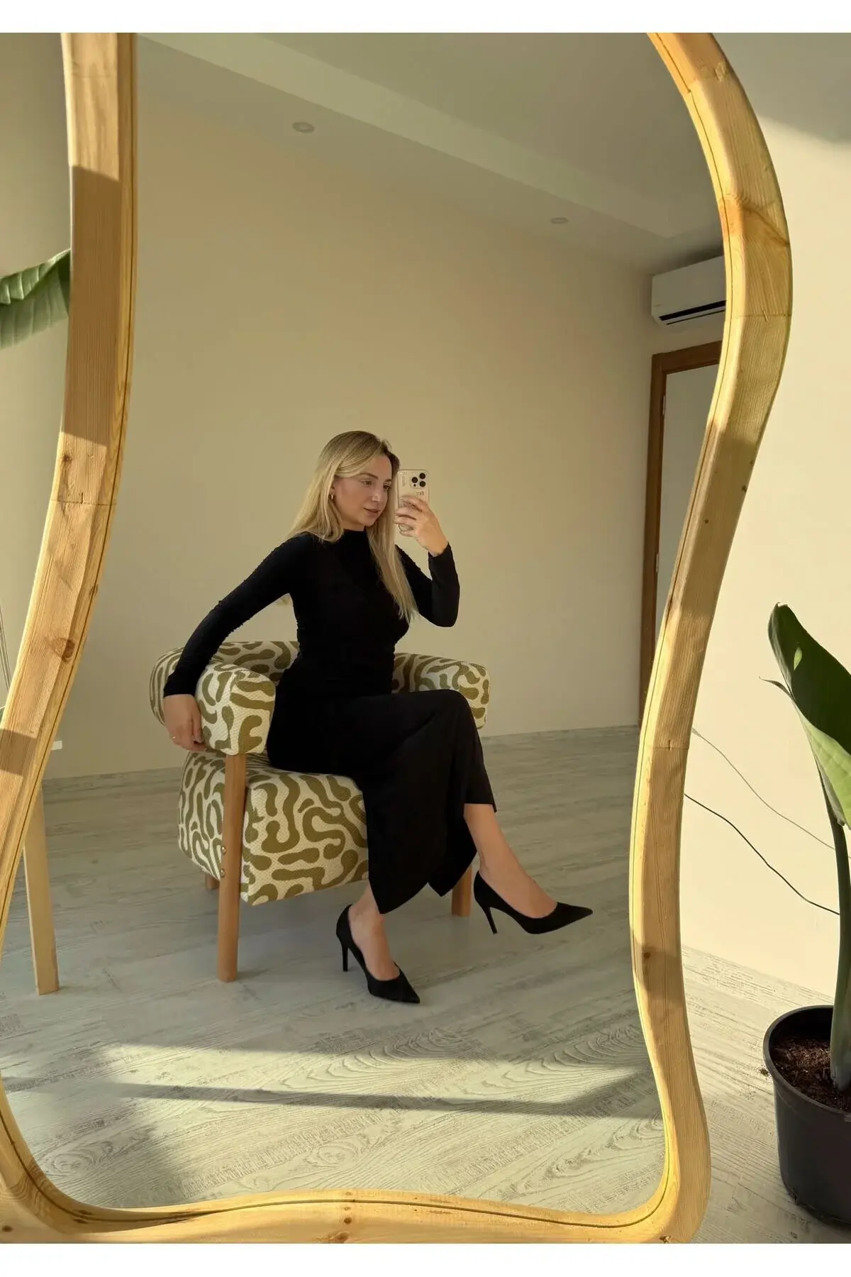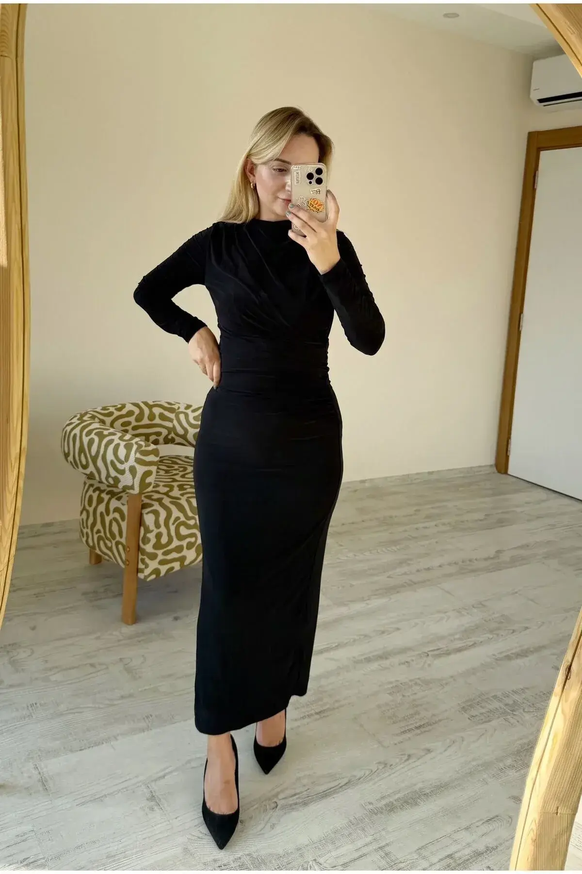 Drape Yaka Yırtmaçlı Uzun Siyah Elbise