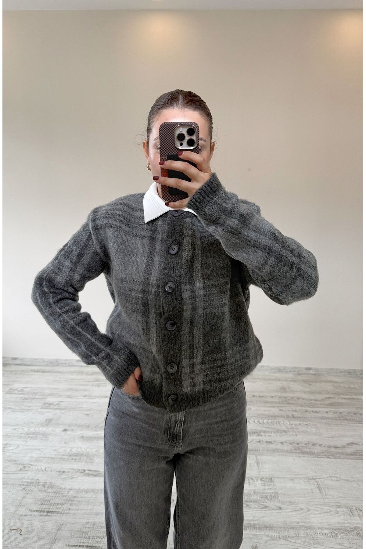 Ekose/Kareli Düğmeli Bisiklet Yaka Hırka Gri