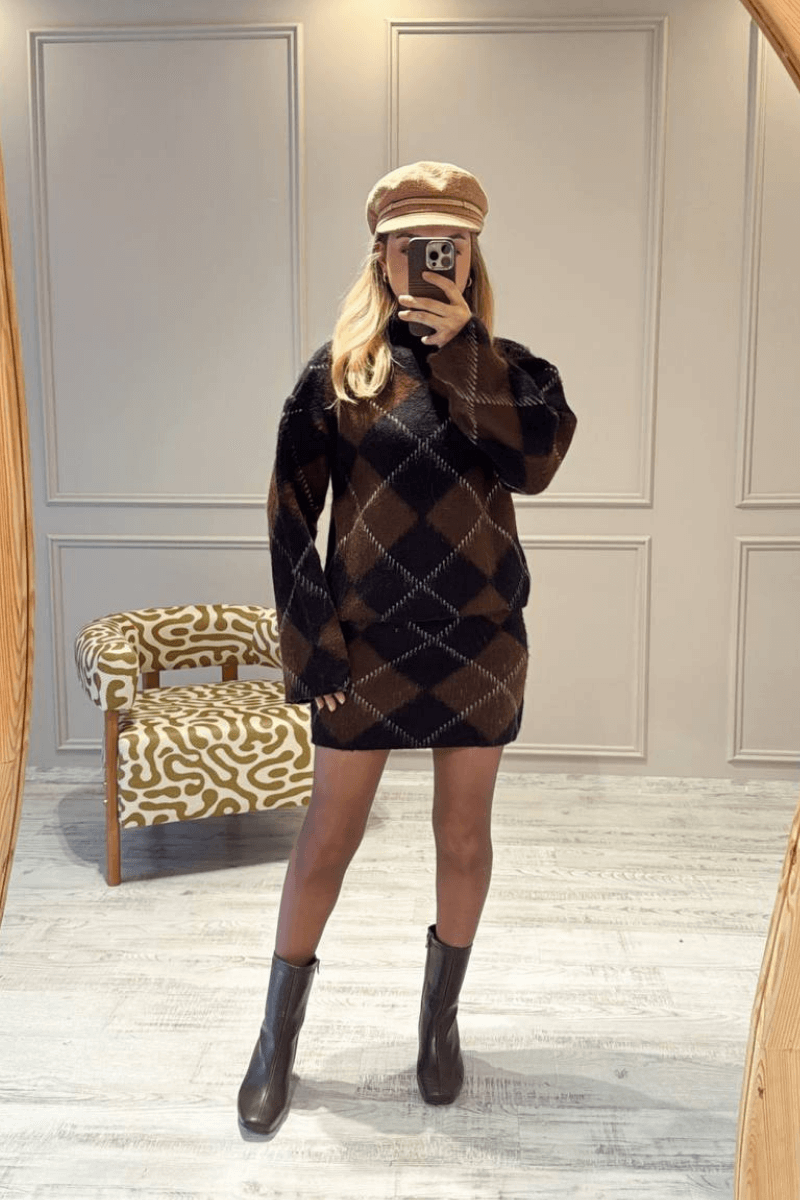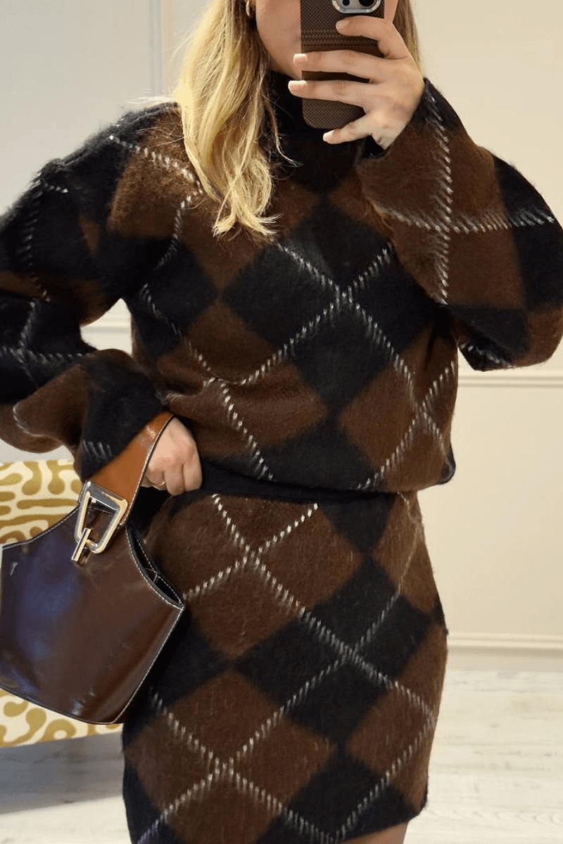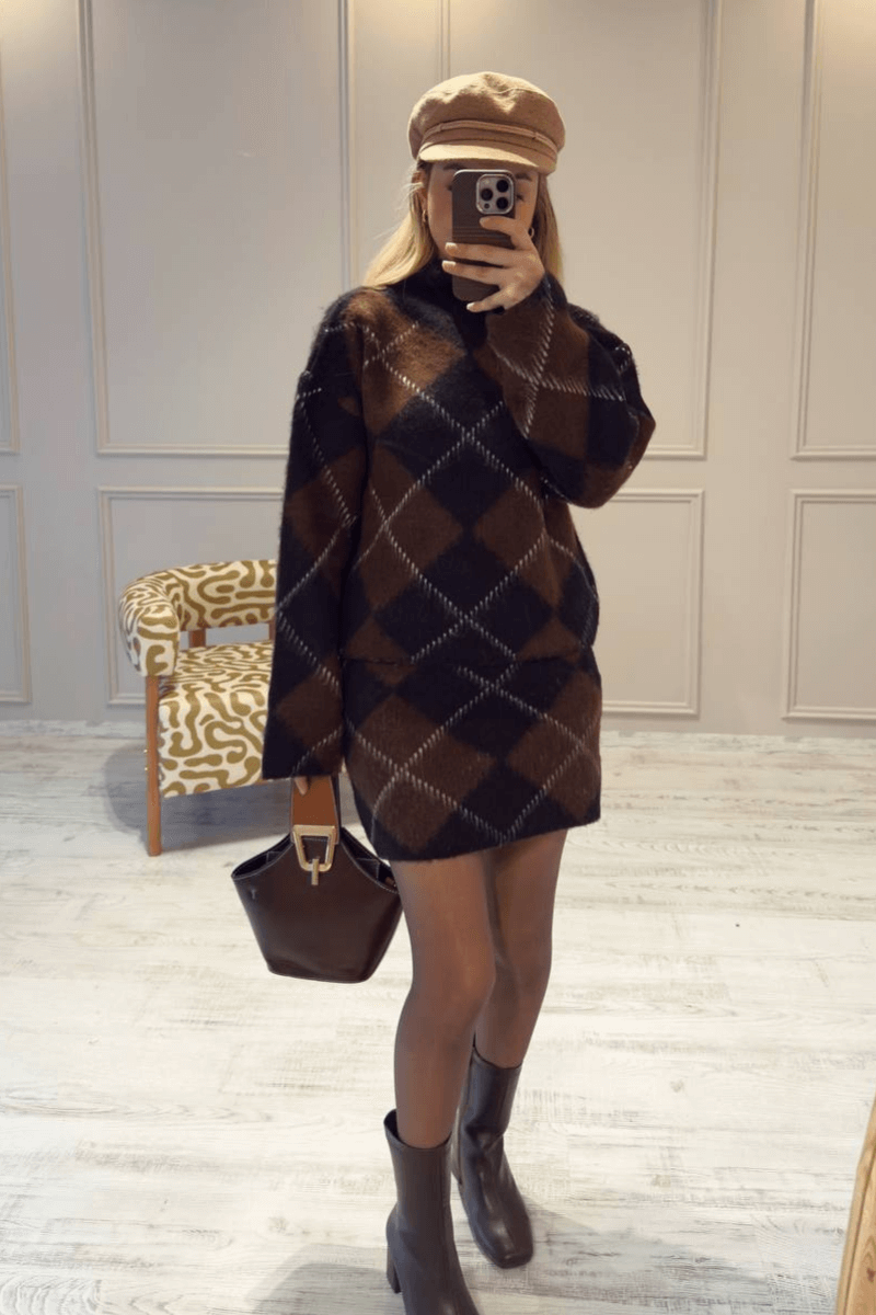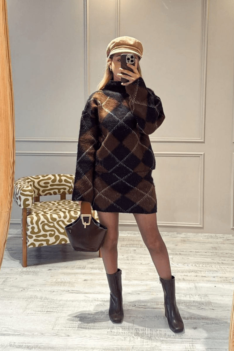 Ekose desenli etek kazak takım, kalın kumaşı sayesinde soğuk havalarda sıcaklık sağlar. Standart bedendir ve modaya uygun renk seçenekleriyle her tarza uygun kombinler oluşturabilirsiniz. Hem şık hem rahat bir görünüm için ideal, farklı ayakkabılar ve aksesuarlarla kolayca tamamlanabilir.