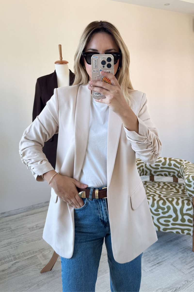 Ekru Kolları Büzgülü Kruvaze Yaka Düğmesiz Blazer Ceket