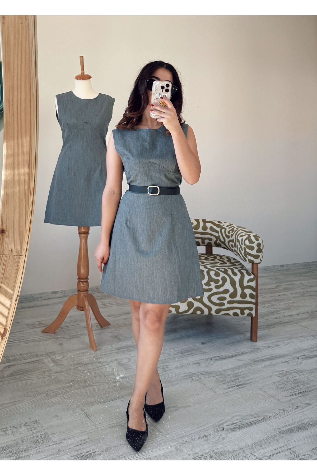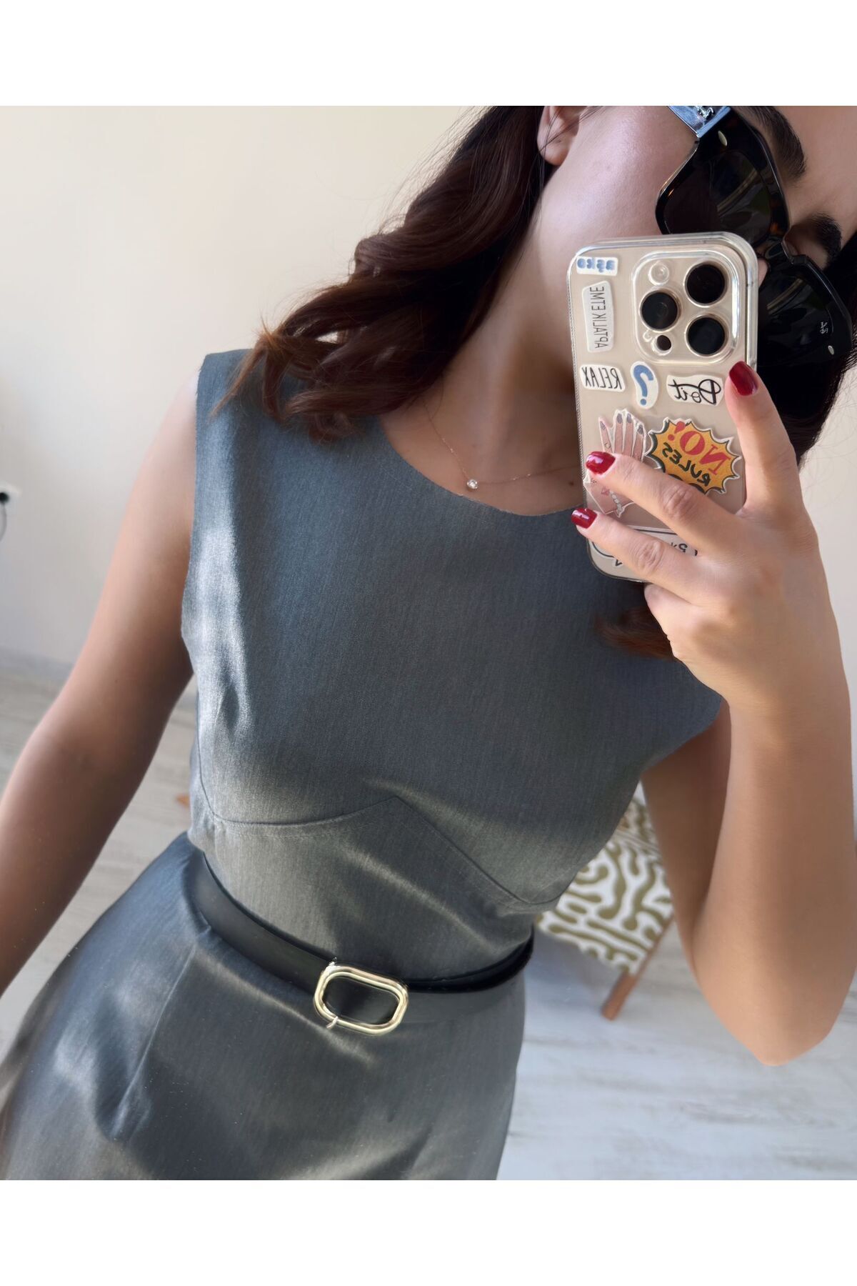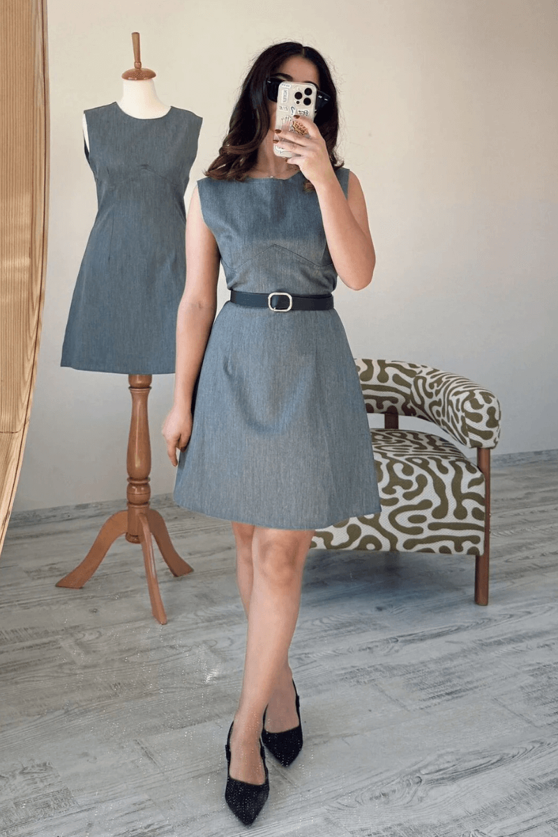 Gri Kısa Ters Biyeli Kolsuz Mini Elbise