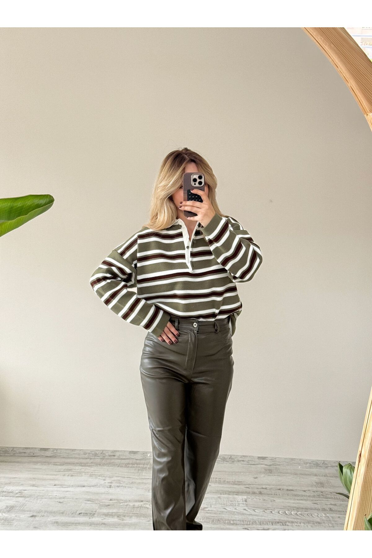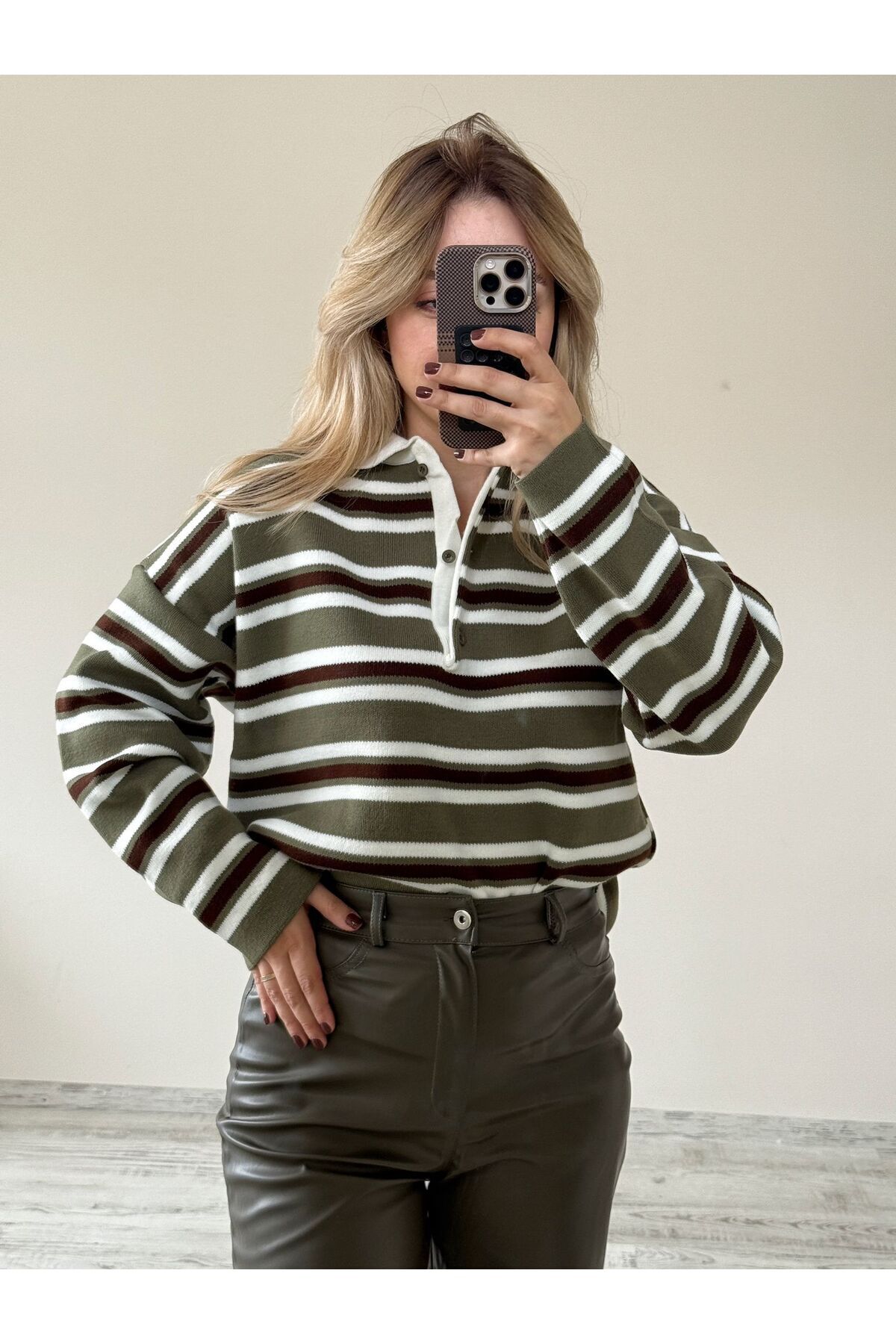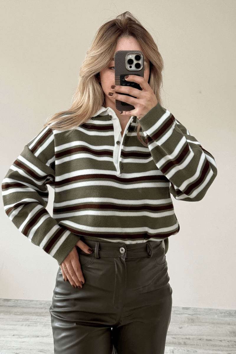 Haki Polo Yaka 3 Düğmeli Çizgili Kazak / Yeşil