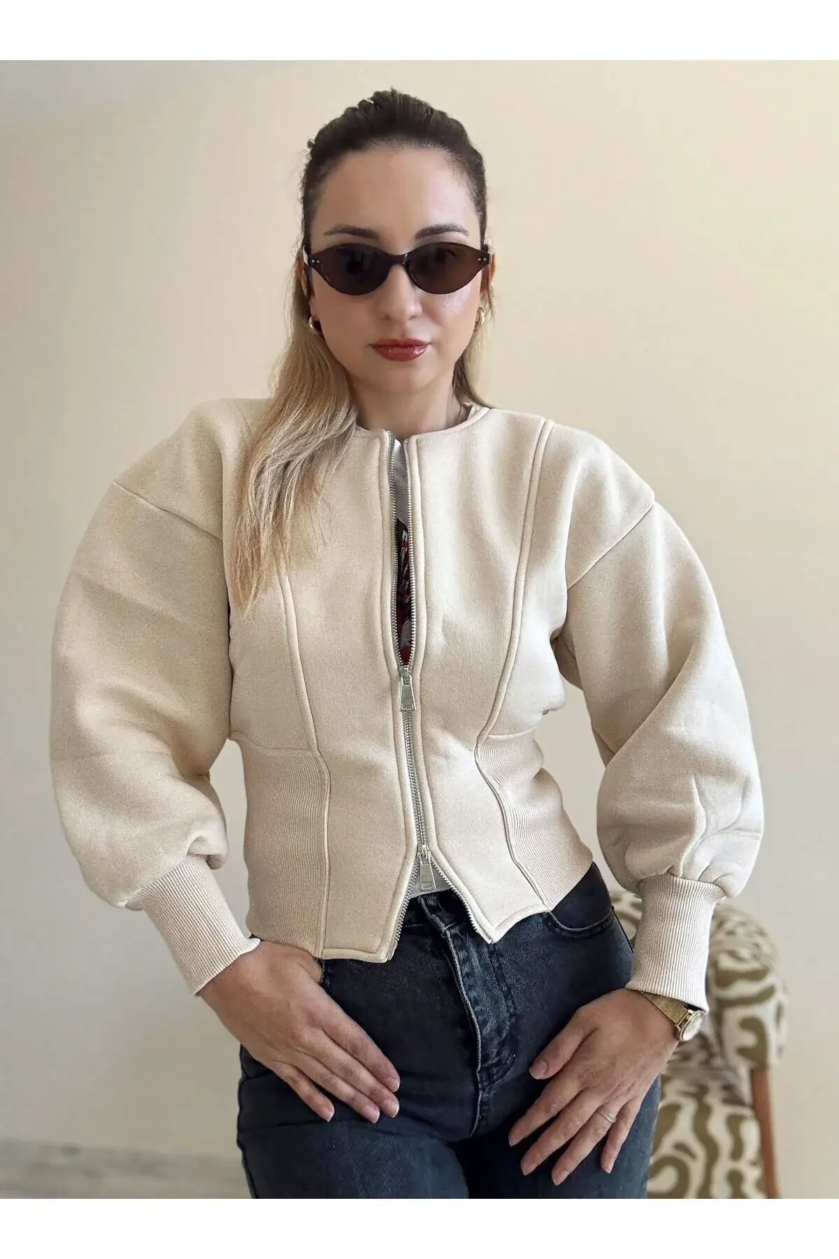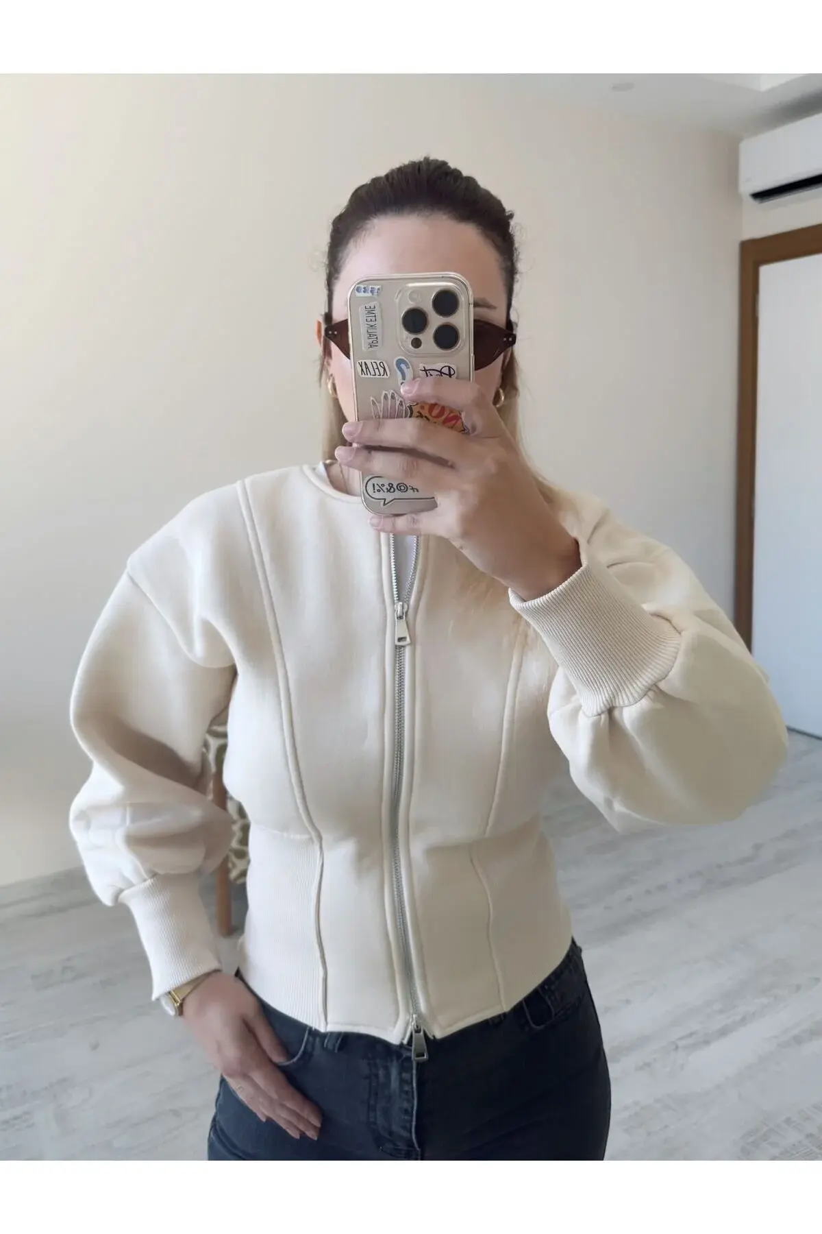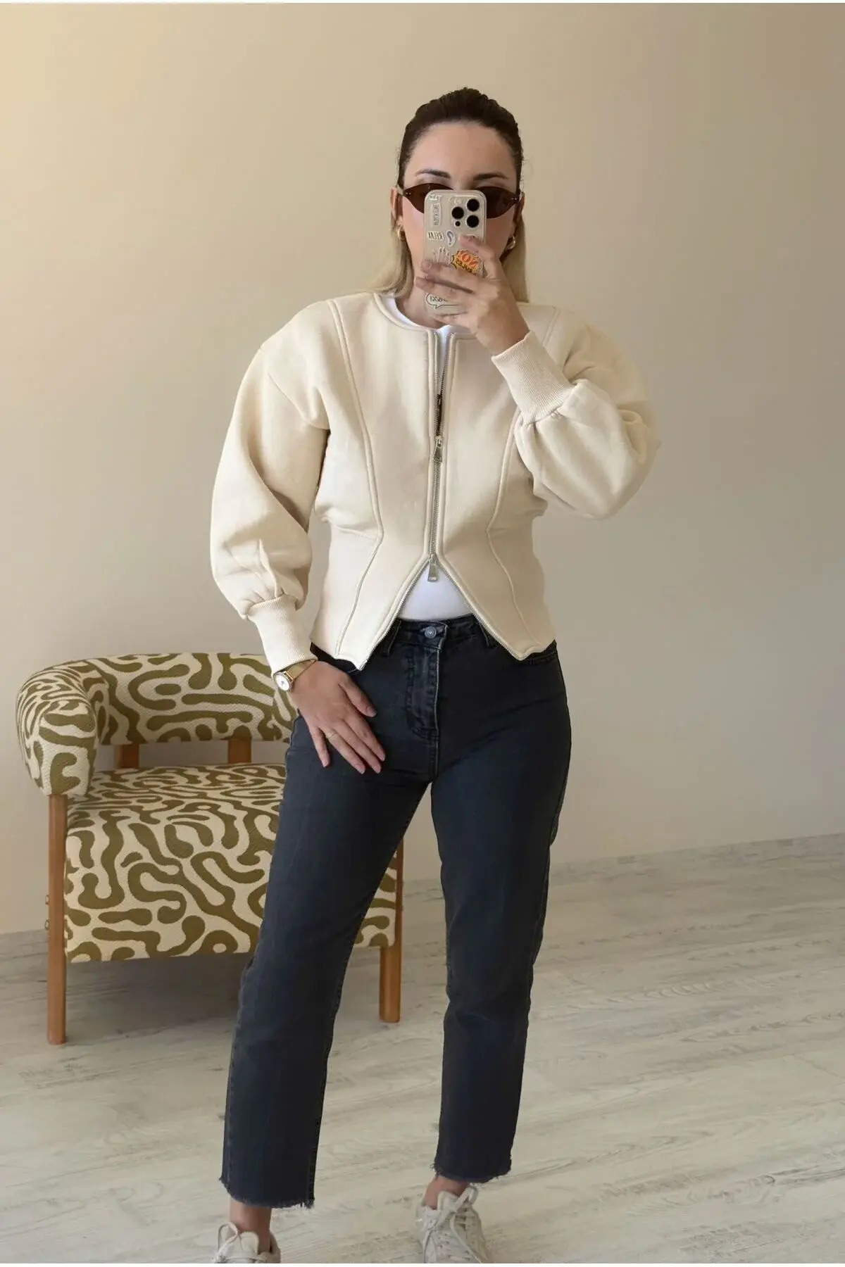 Kadın Ribana Detaylı Fermuarlı Üç İplik Hırka