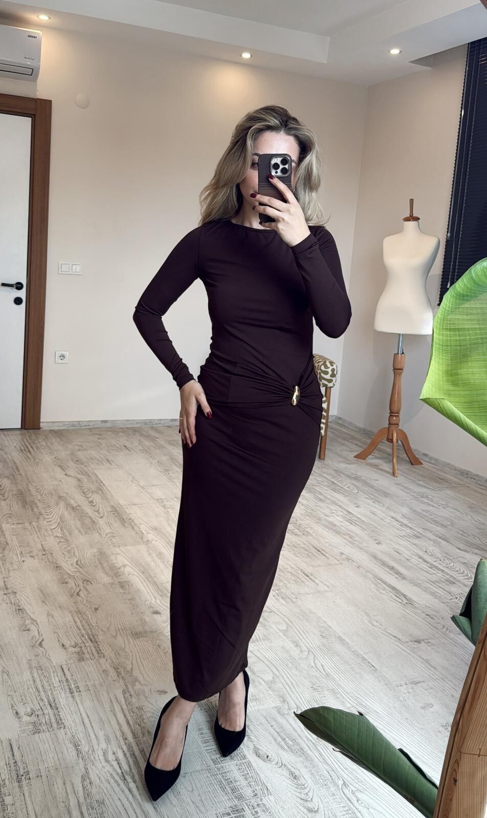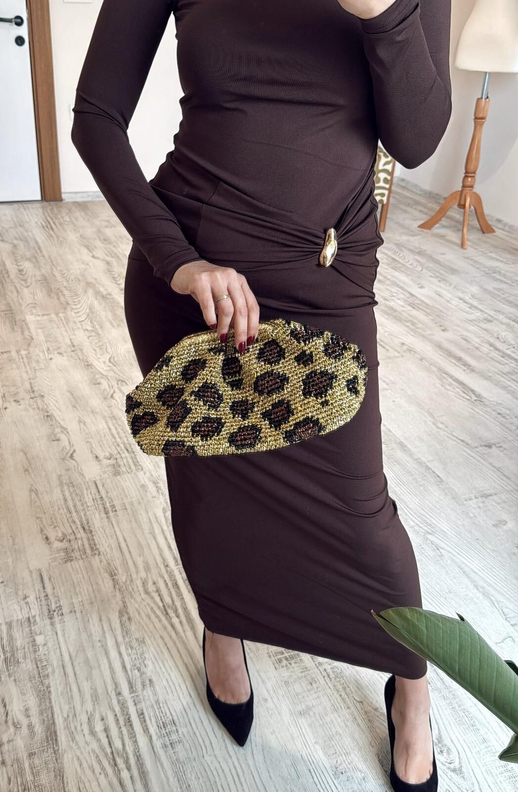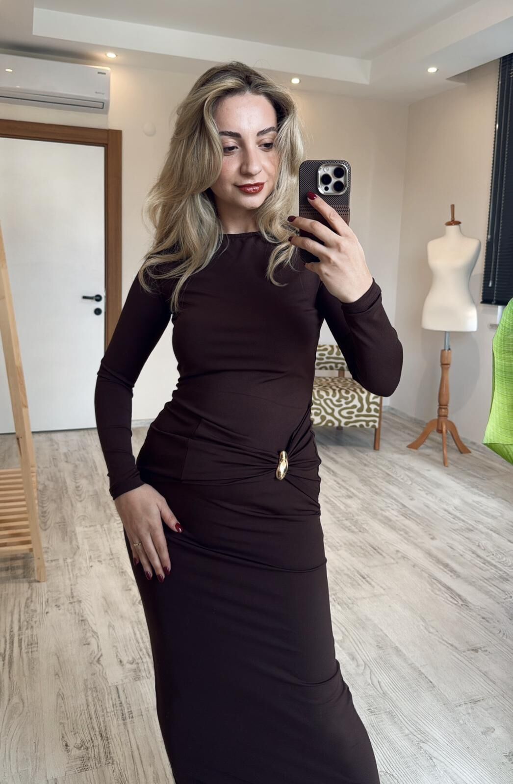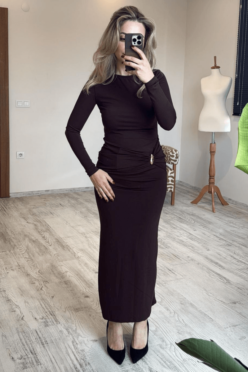 Kahverengi Gold Aksesuarlı MaxiBoy Elbise