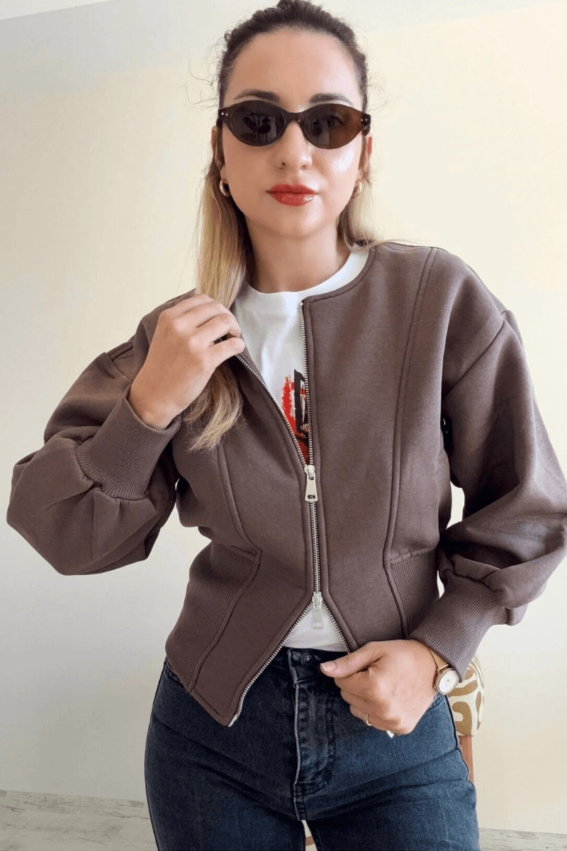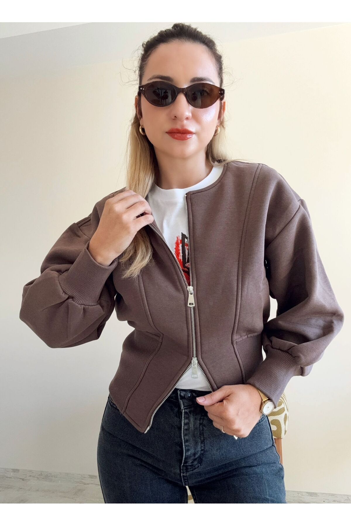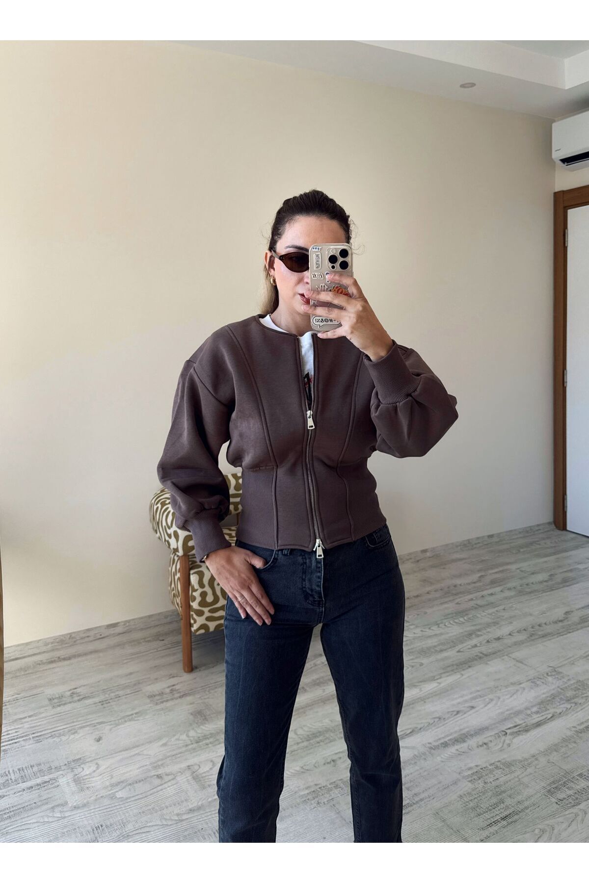 Kahverengi Kadın Ribana Detaylı Fermuarlı Üç İplik Hırka
