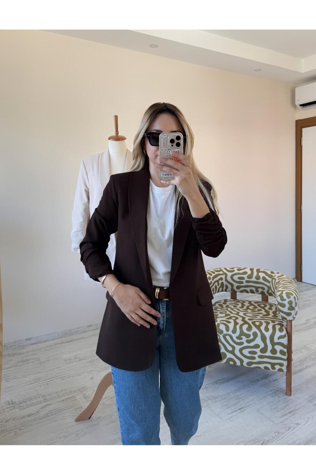 Kahverengi Kolları Büzgülü Kruvaze Yaka Düğmesiz Blazer Ceket