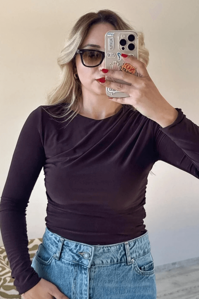 Kahverengi Tek Omuzda Büzgü Detaylı Body Suıt