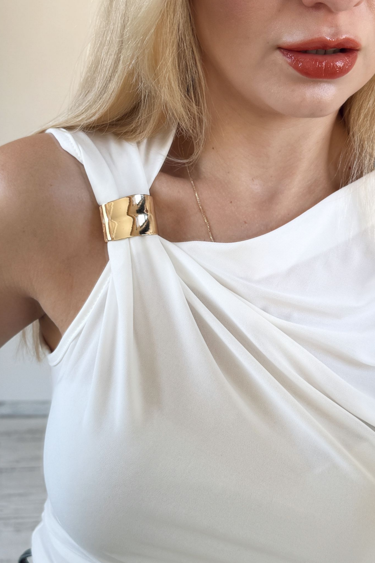 Kol Aksesuar Detaylı Büzgülü Tek Omuz Bluz