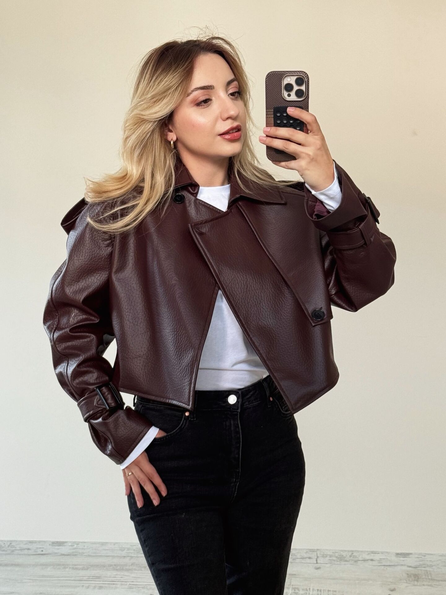 Kolları Kemerli Tek Düğmeli Bordo Deri Ceket