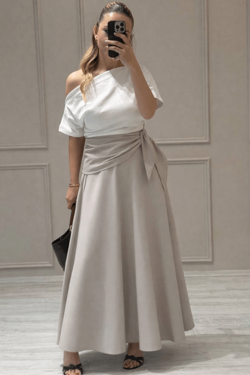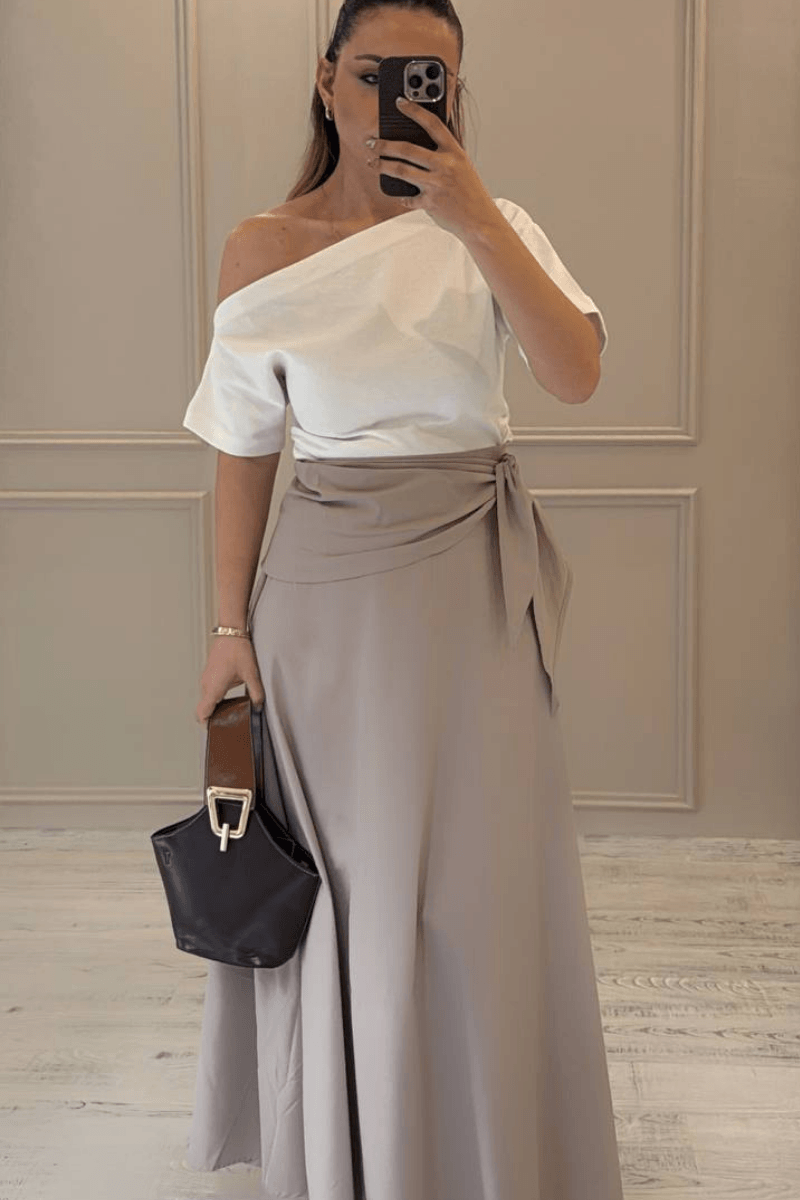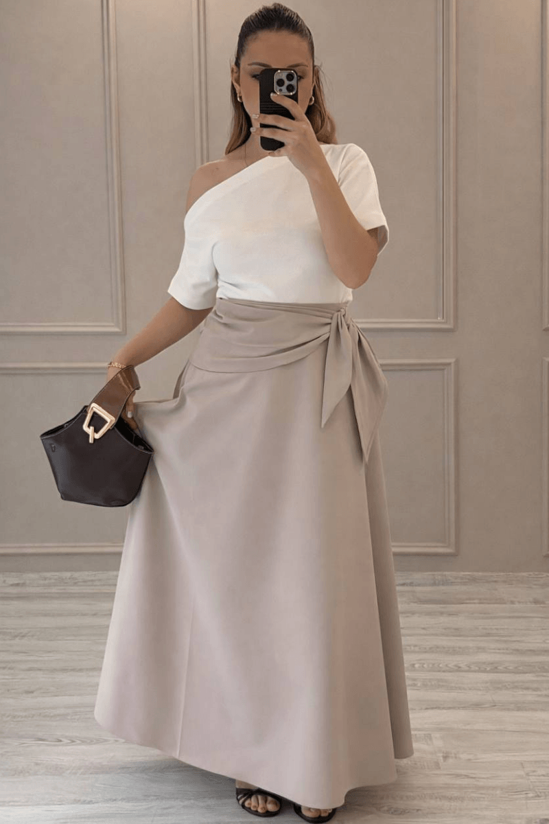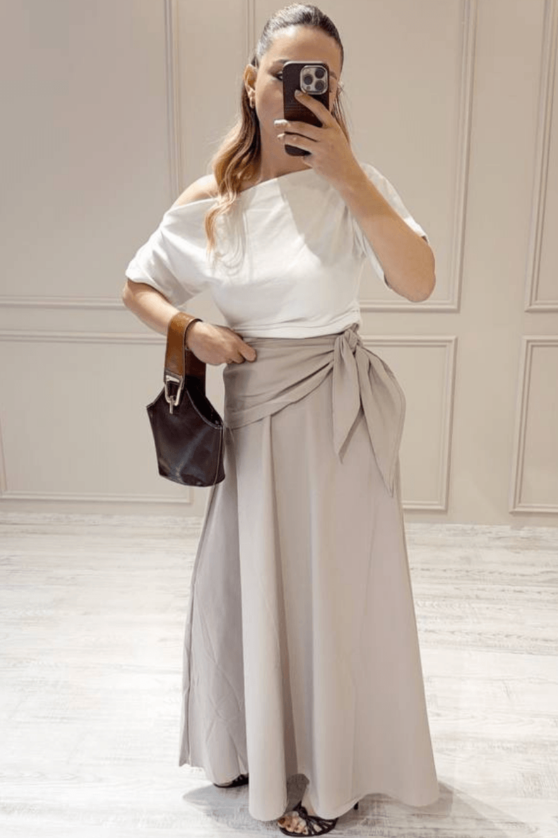 Krem rengi maxi boy fularlı etek, hem şıklığı hem rahatlığı bir arada sunar. Nefes alan kumaşı ile konfor sağlar, tesettüre uygun tasarımıyla özel gün ve davetlerde öne çıkar. Krem tonları sayesinde kolay kombinlenir, gardırobunuzun vazgeçilmezi olmaya aday..