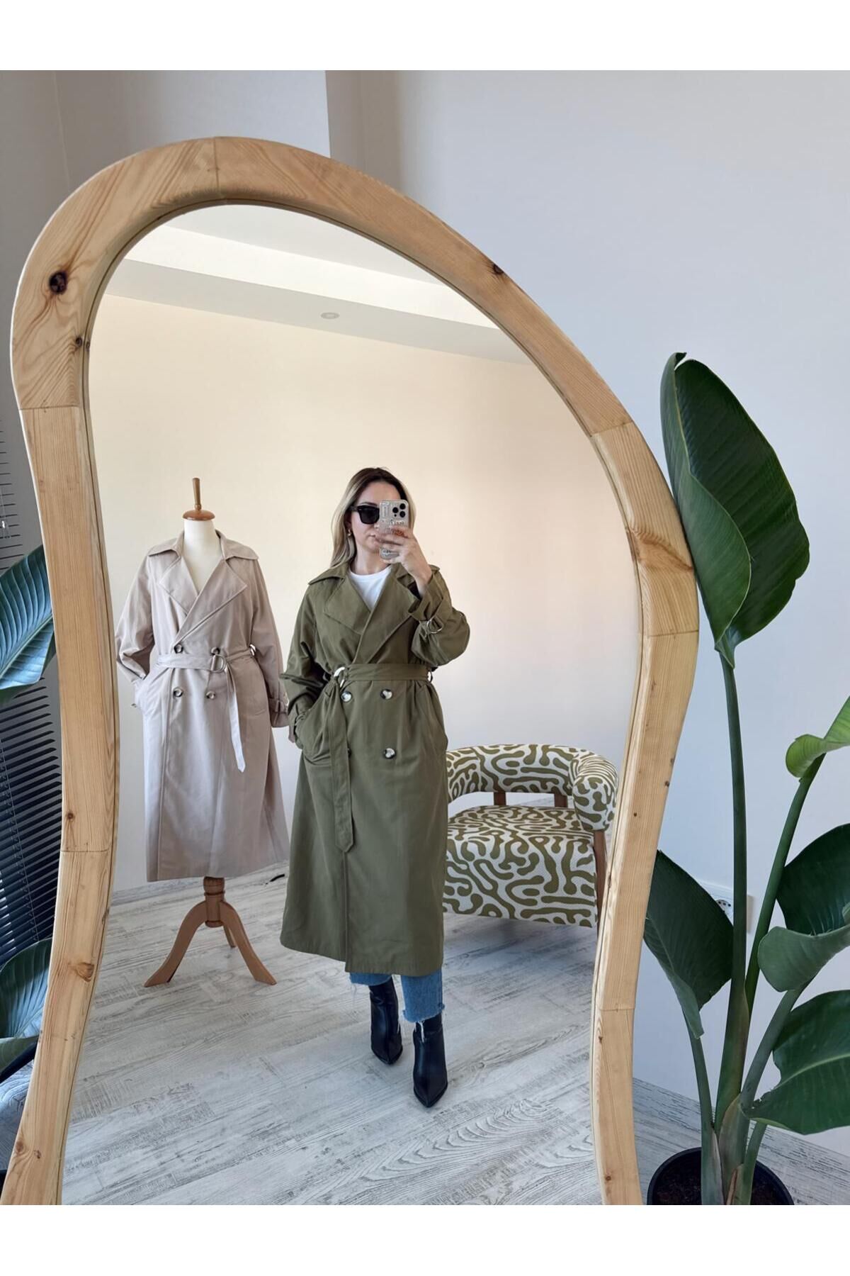 Kruvaze Yaka Kolları Kemerli Düğmeli Uzun Trençkot