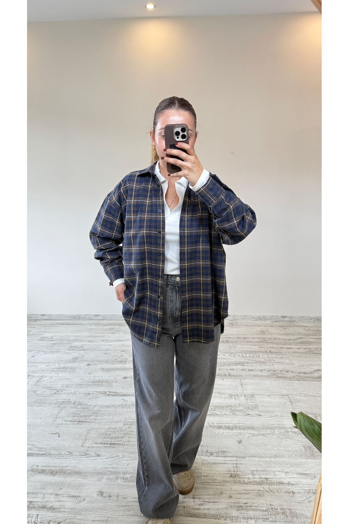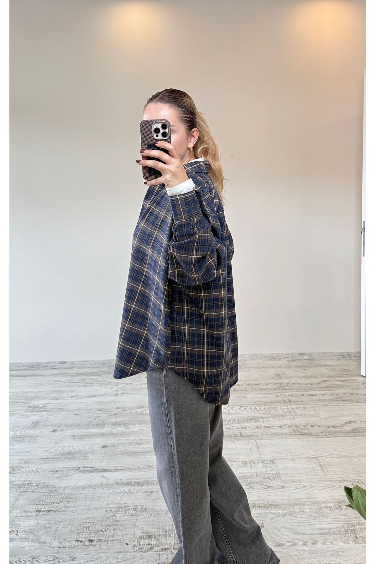 Lacivert Ekose/Kareli Oversize Gömlek