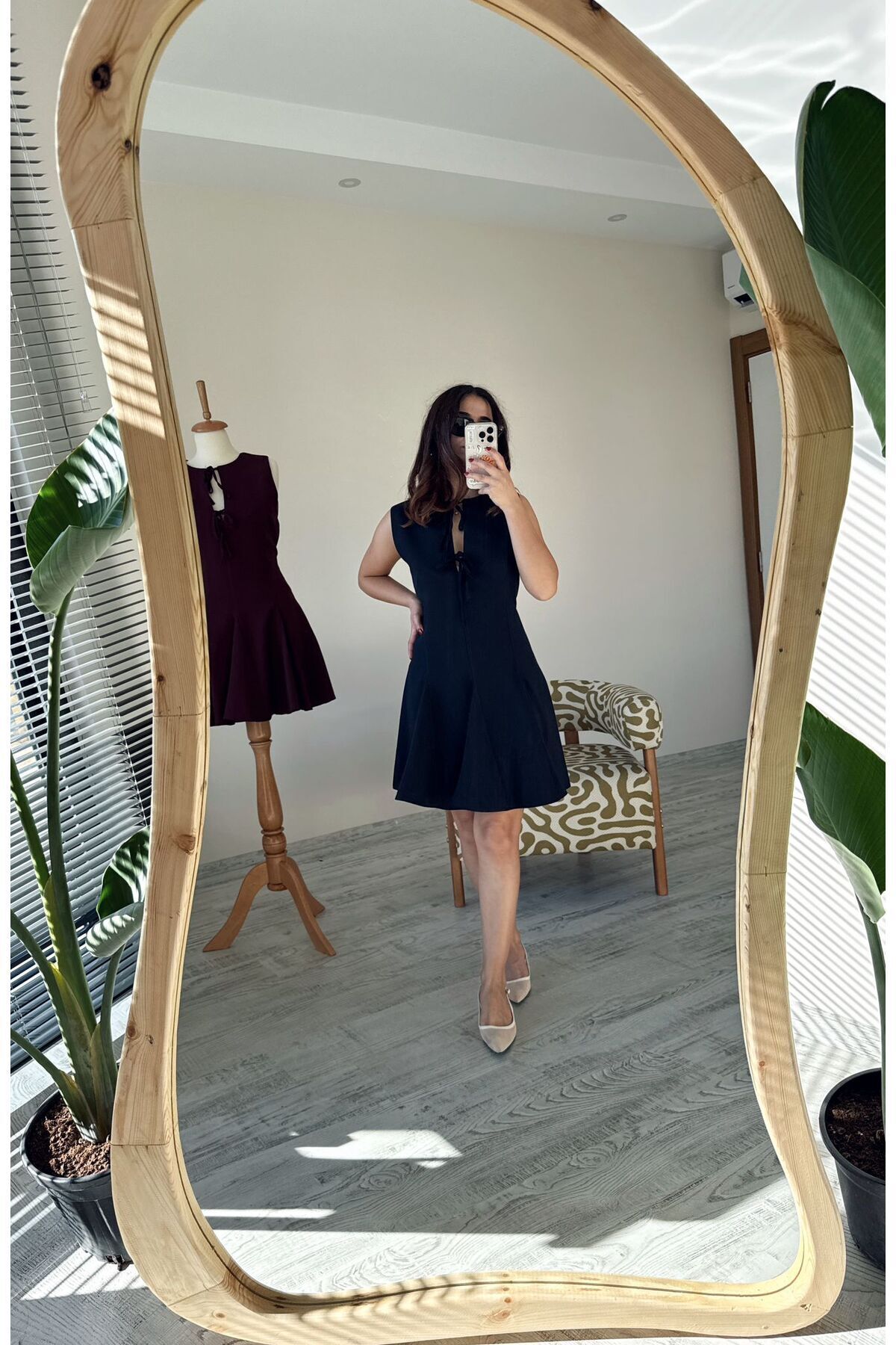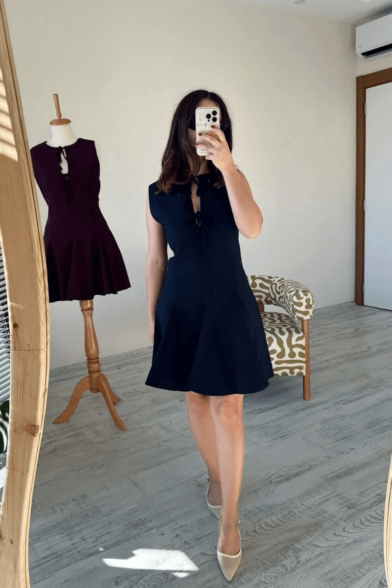 Lacivert Önü Fiyonklu Pileli Mini Viskon Elbise