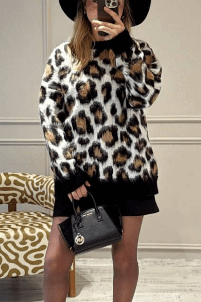 Leopar desenli yün kazak, şık tasarımı ve kalın yün karışımlı kumaşıyla soğuk günlerde maksimum sıcaklık sağlar. Modern moda trendlerine uygun bu kolay kombinlenebilir kazak, stilinize dikkat çekici bir dokunuş katarken konfor sunar. Hem casual hem de şık görünümler için idealdir.
