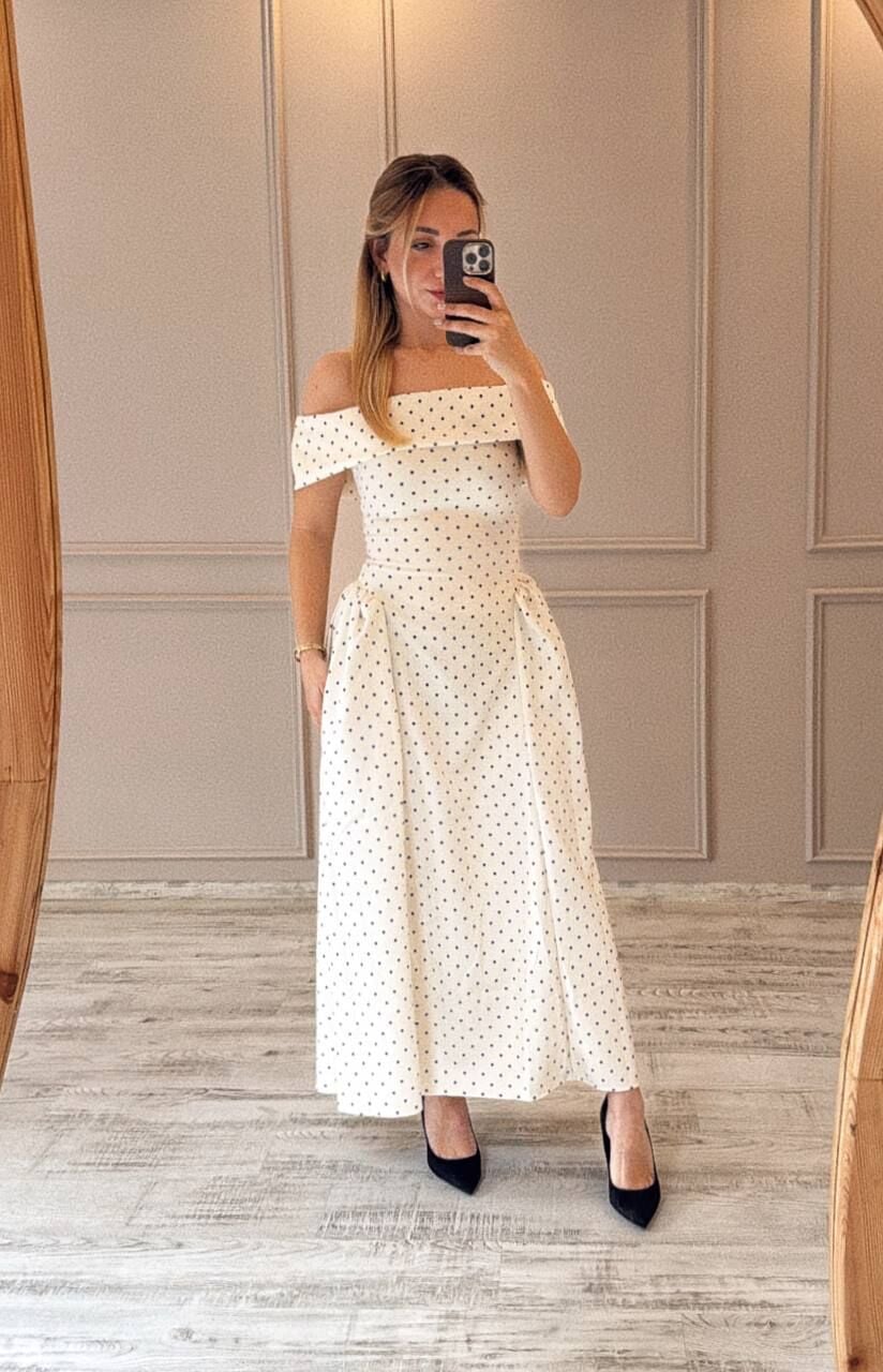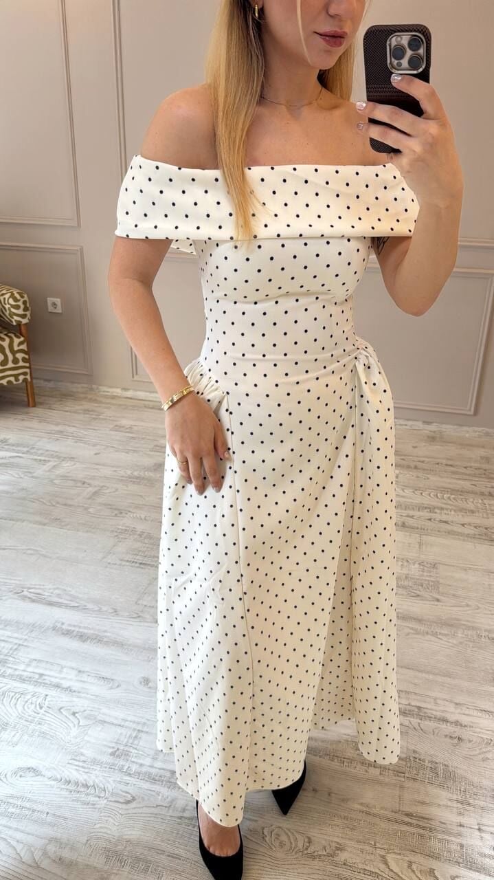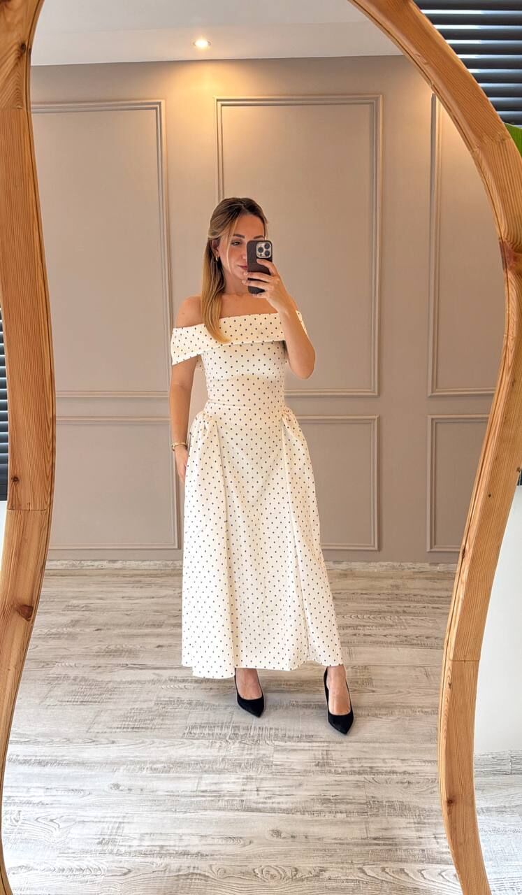 Puantiyeli midi boy elbise, şıklığı ve zarafeti bir arada sunar. Nefes alan kumaşı sayesinde uzun süre konforlu kullanım sağlar. Düşük omuz detayı, romantik bir dokunuş katar. Özel günlerinizde fark yaratmak için ideal bir tercih. Hem rahat hem stil sahibi görünmek isteyenlere uygundur.