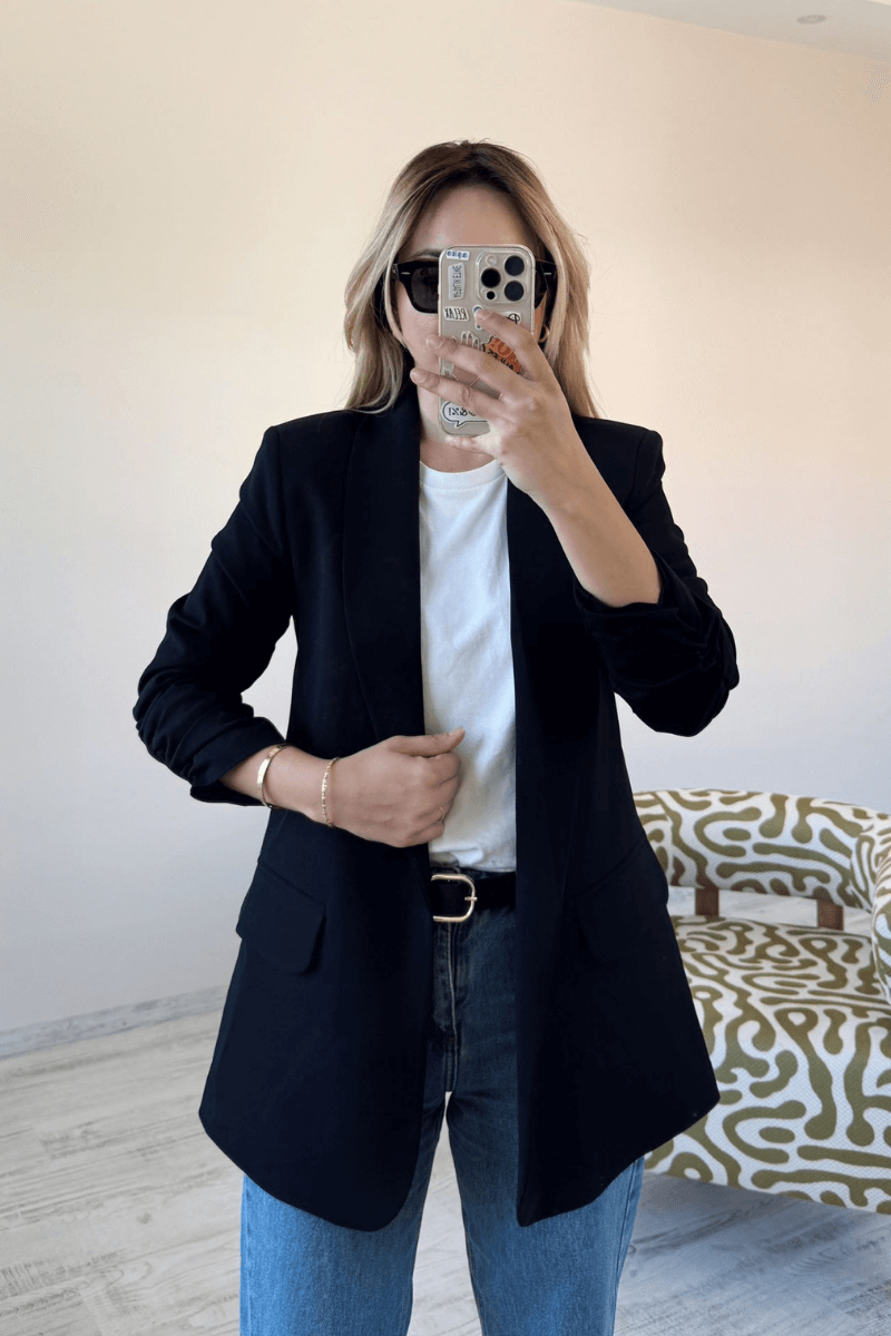 Siyah Kolları Büzgülü Kruvaze Yaka Düğmesiz Blazer Ceket