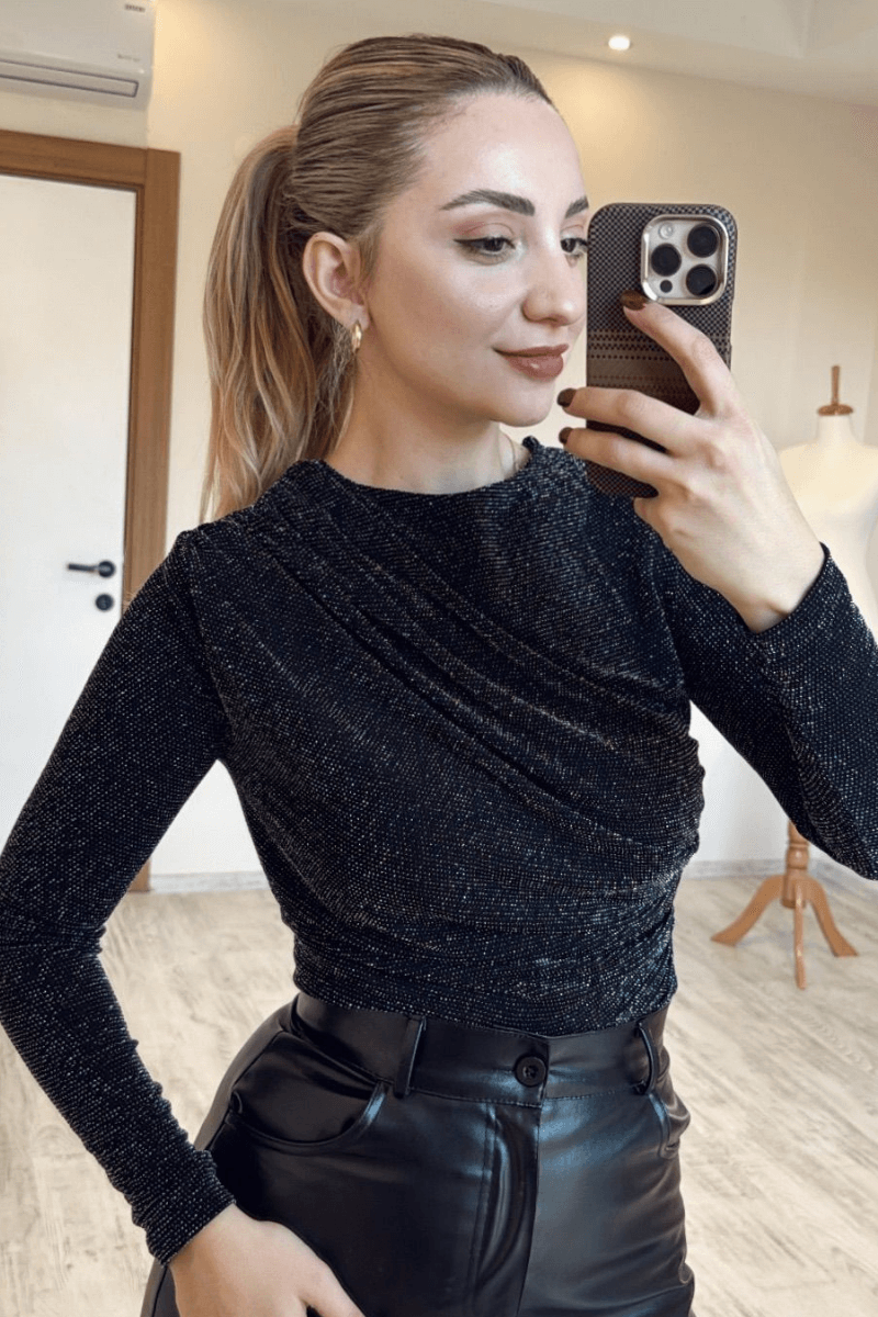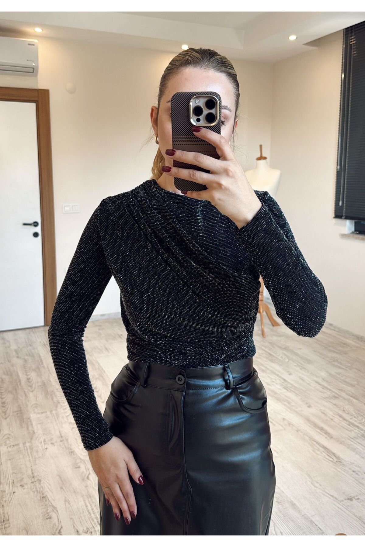 Siyah Simli Omuzdan Drape Detaylı Bluz