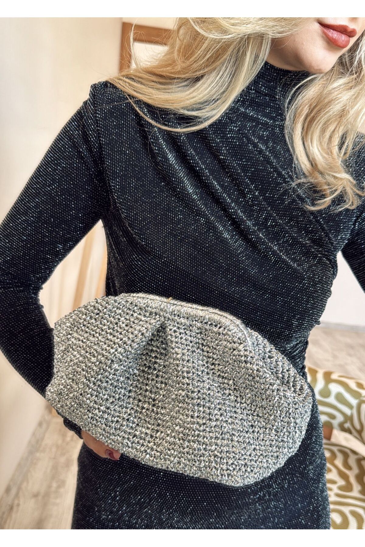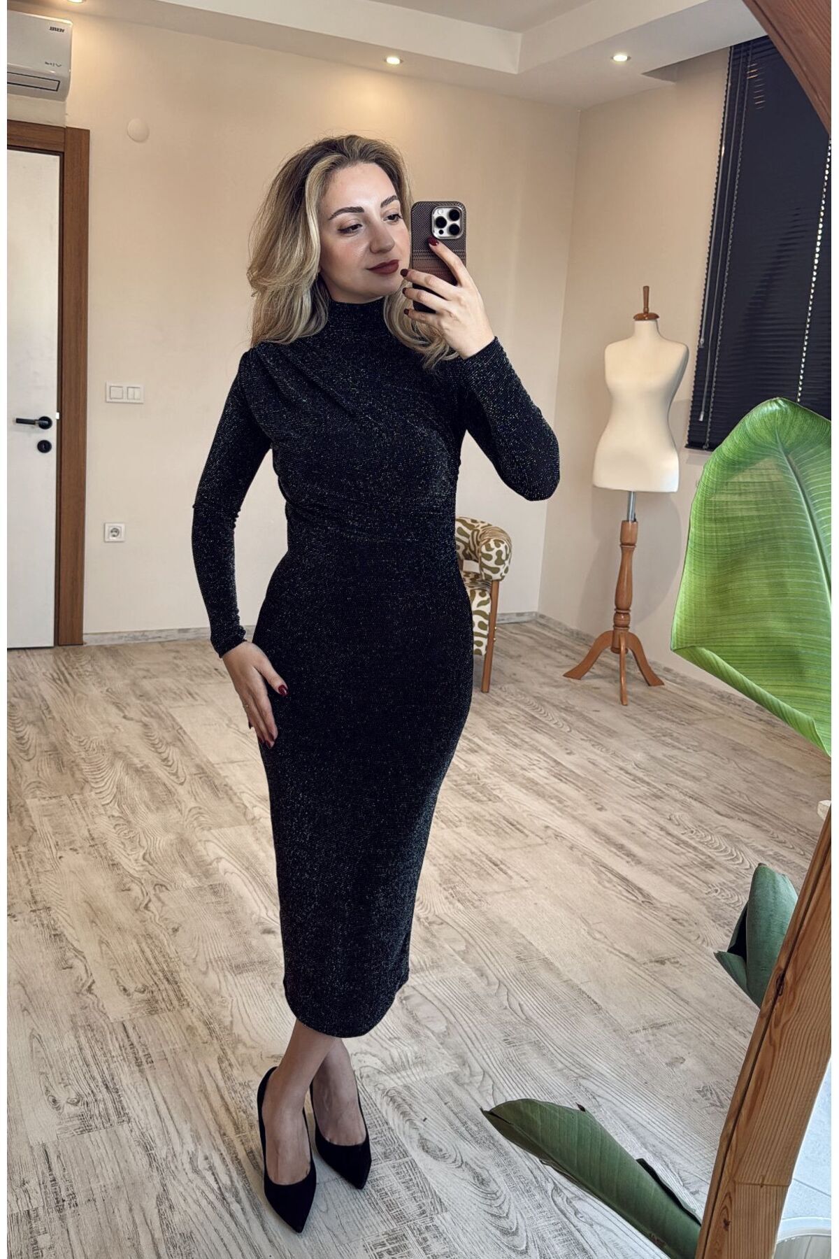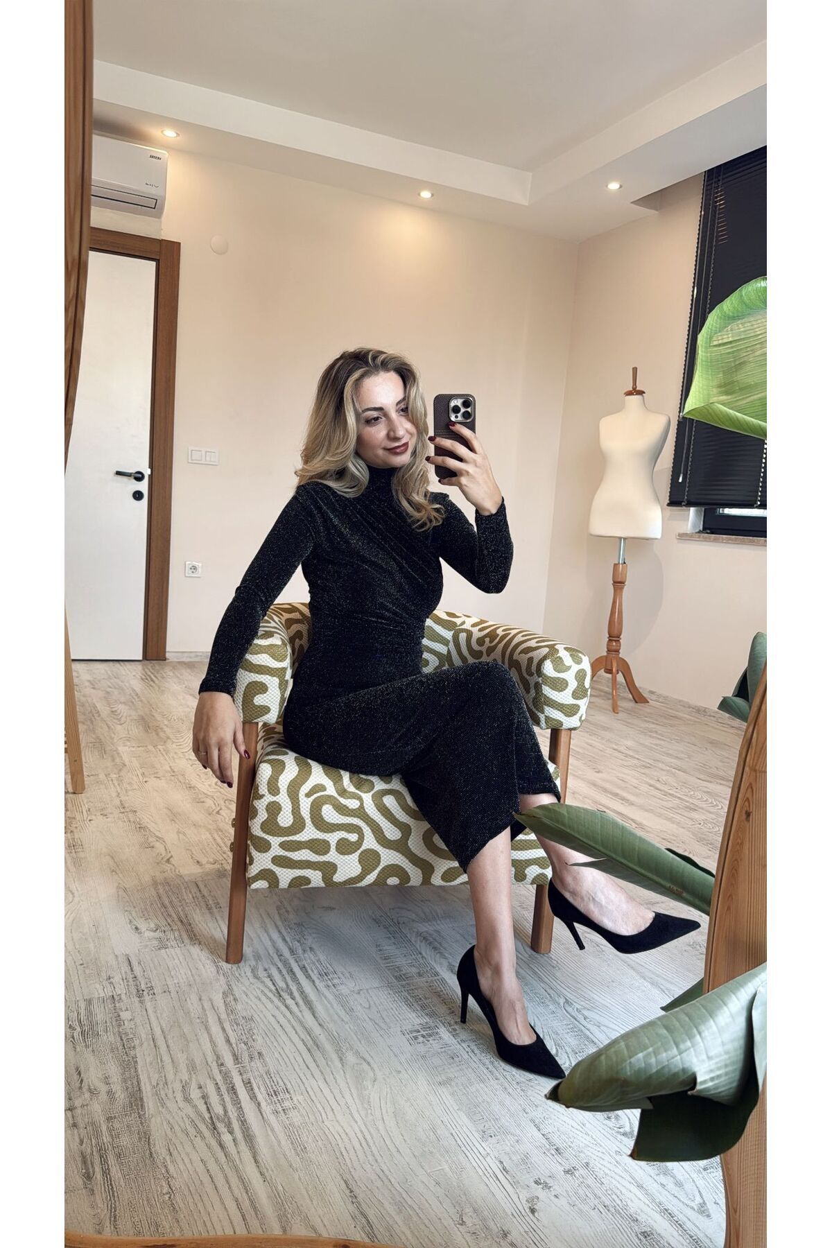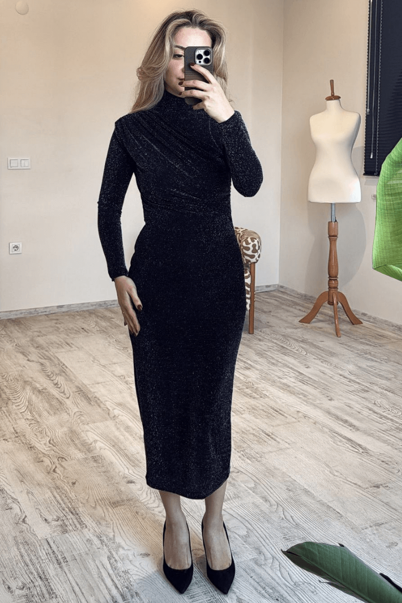 Siyah Simli Yarım Boğaz İnce Kumaş Gece Elbisesi