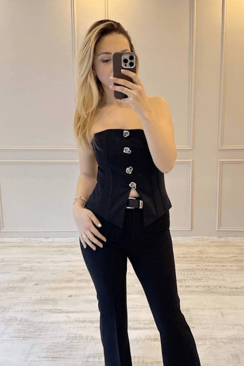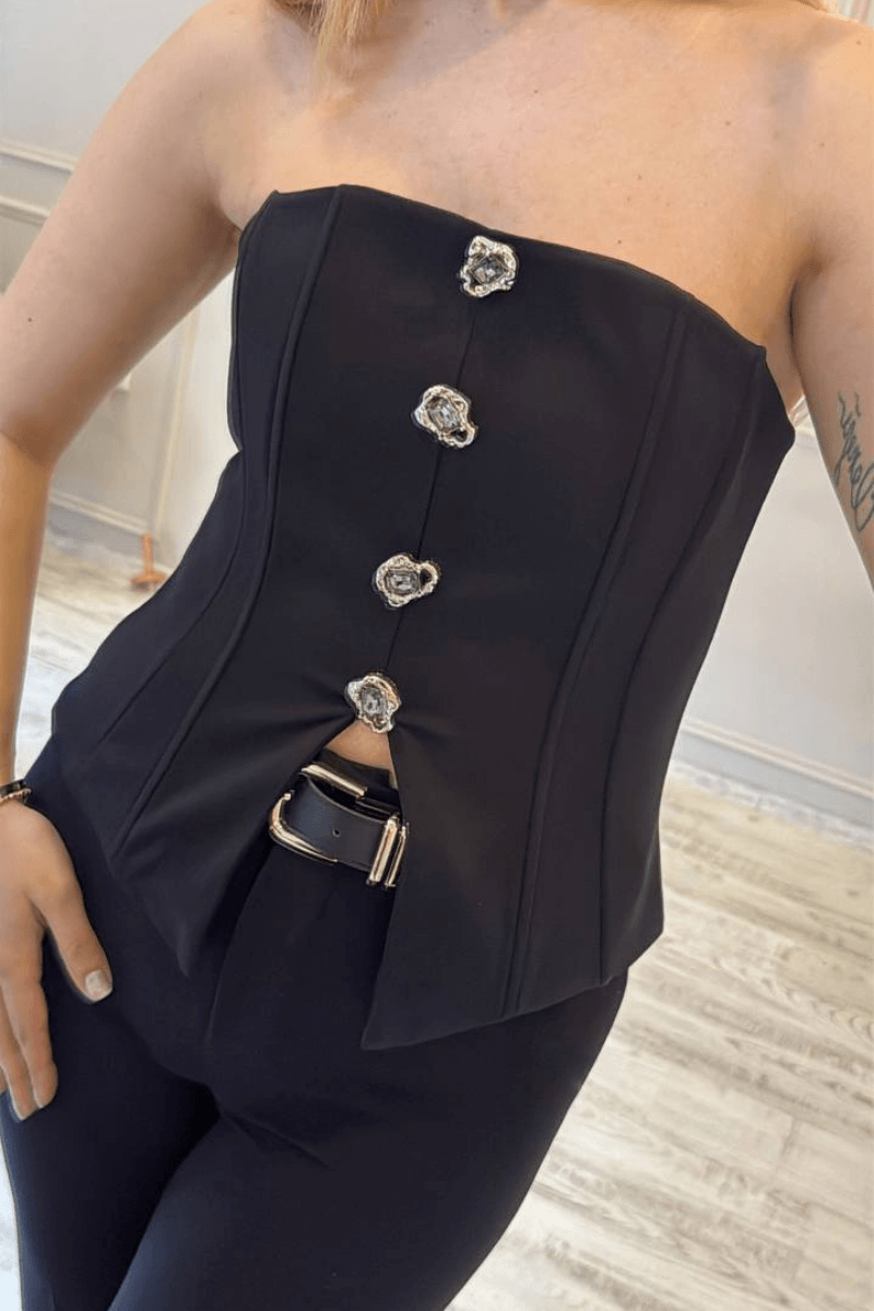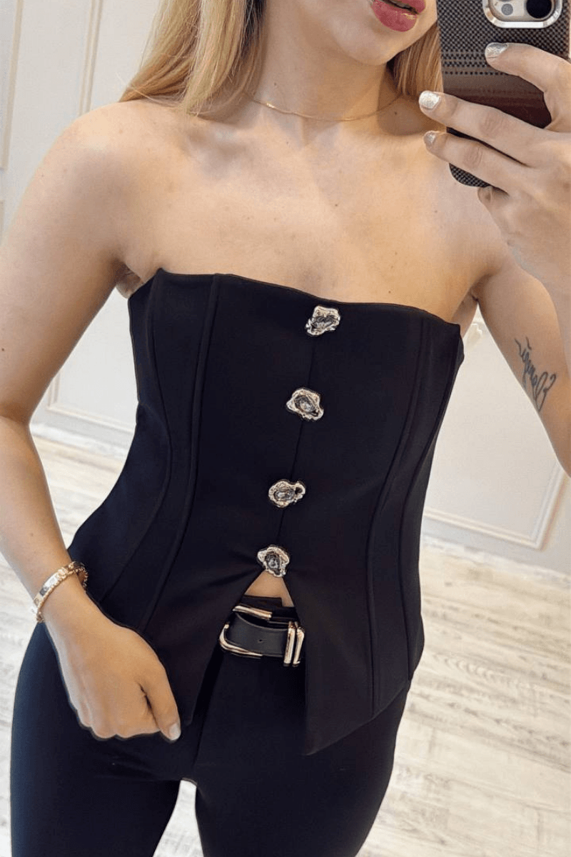 Siyah straplez büstiyer, şıklığı ve zarafeti bir arada sunar. Siyahın asaletiyle taşlı düğmeler dikkat çeker. Tam beden seçimiyle kusursuz uyum sağlar. Gece davetleri ve özel anlar için ideal, gardırobunuzun vazgeçilmez parçası olmaya aday.