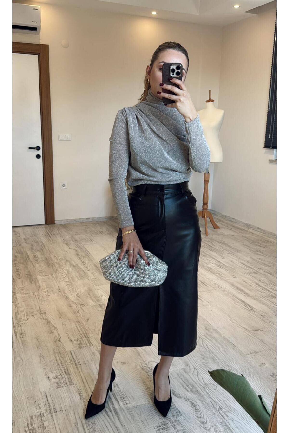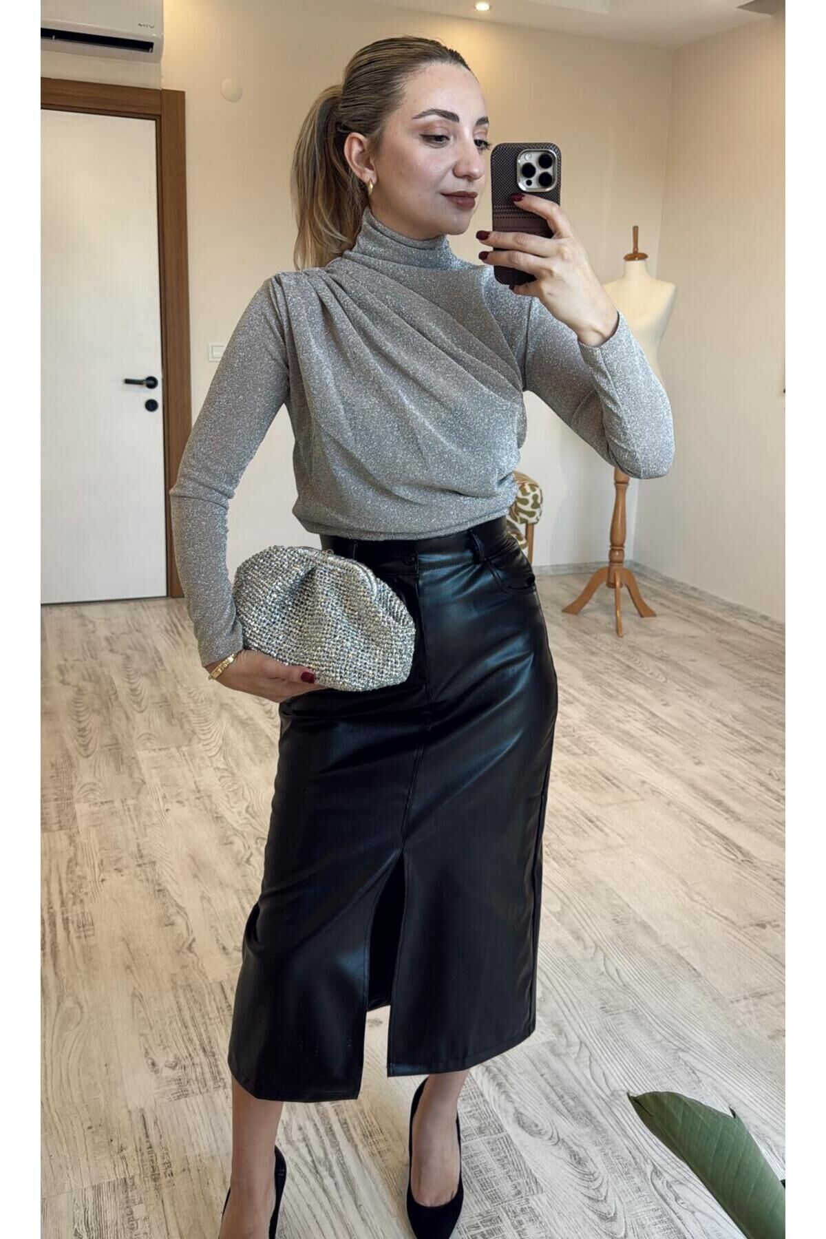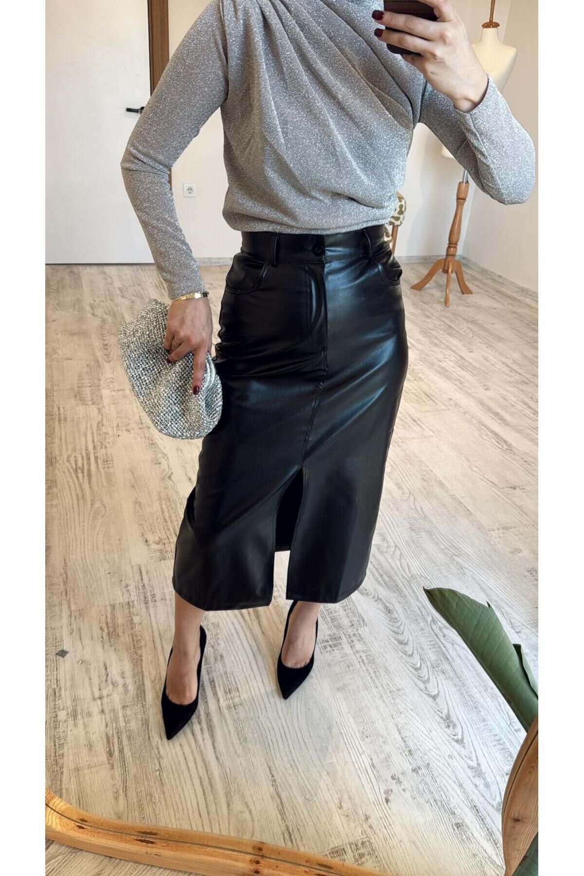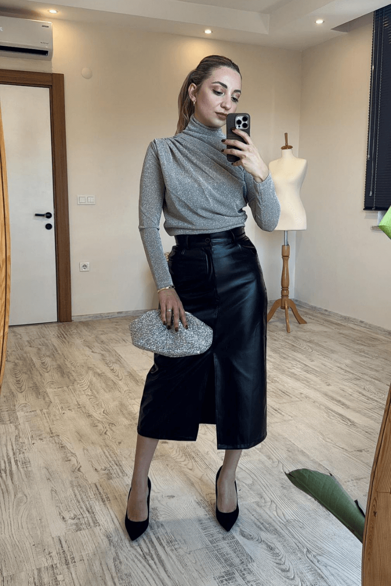 Yüksek bel tasarımı ile beli toparlayan ve vücut hatlarını zarif şekilde ortaya çıkaran şık etek Deri görünümlü kaliteli kumaşı sayesinde modern ve iddialı stil sunar Midi boy kesimi ile hem günlük hem de özel davet kombinlerine uygundur Ön yırtmaç detayı sayesinde hem şık hem rahat hareket imkânı sağlar Düz ve sade tasarımı ile bluz, kazak ve gömleklerle kolay kombinlenir Vücuda oturan kalıbı ile feminen ve güçlü bir siluet oluşturur Günlük kullanım, ofis stili ve gece kombinleri için ideal Zamansız siyah rengi ile her sezon trend ve kurtarıcı parça Topuklu ayakkabı, bot veya sneaker ile rahatlıkla kombinlenebilir Şık davetler, akşam yemekleri ve özel günler için ideal tercih (Ölçüler düz zeminde, ürünün ön kısmından alınmıştır.