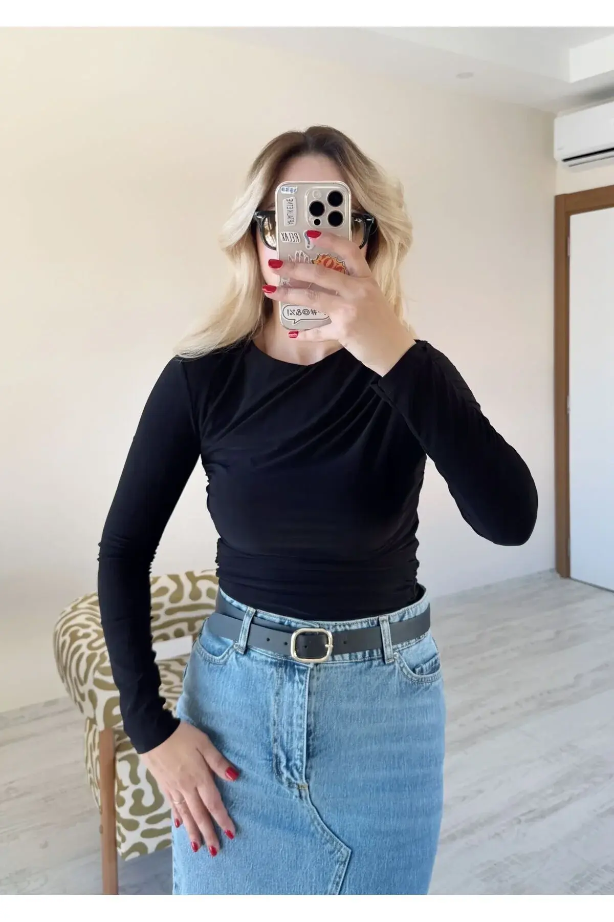 Tek Omuzda Dökümlü Detaylı Body Suit
