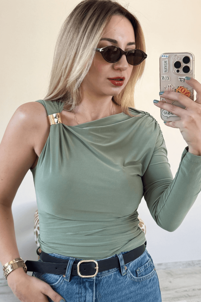 Yeşil Kol Aksesuar Detaylı Büzgülü Uzun Kollu Bluz